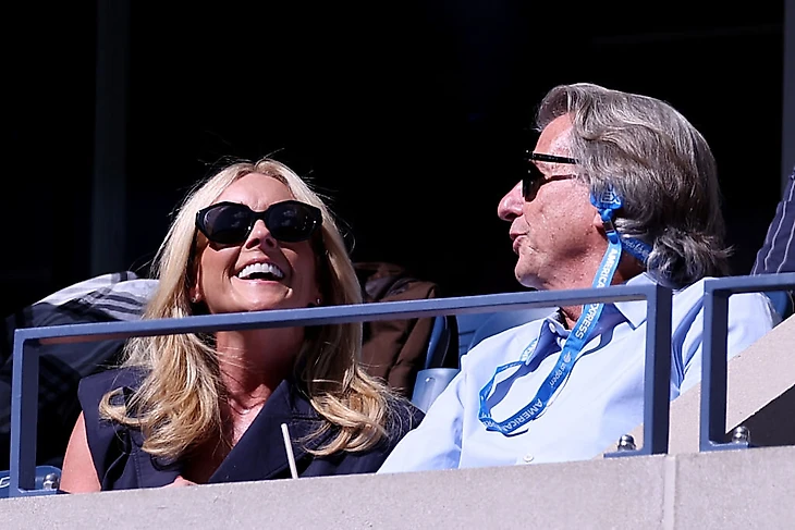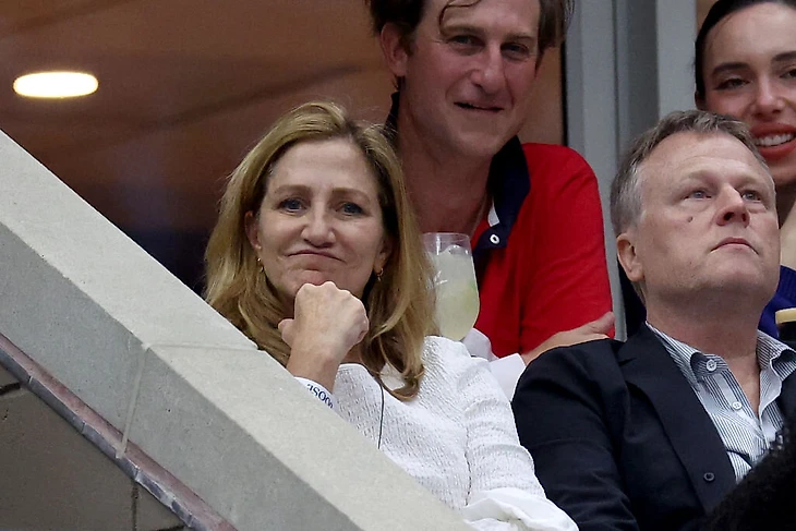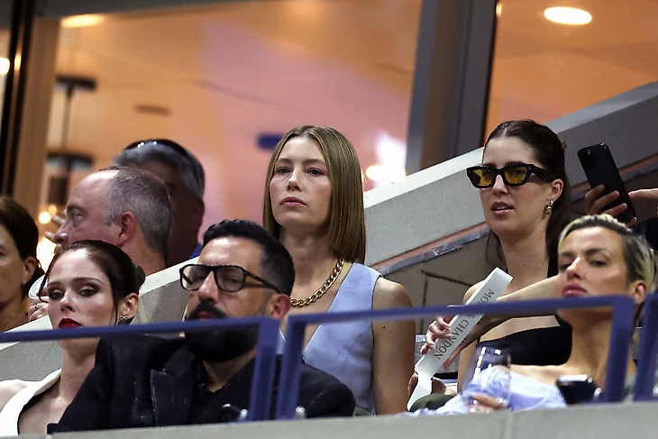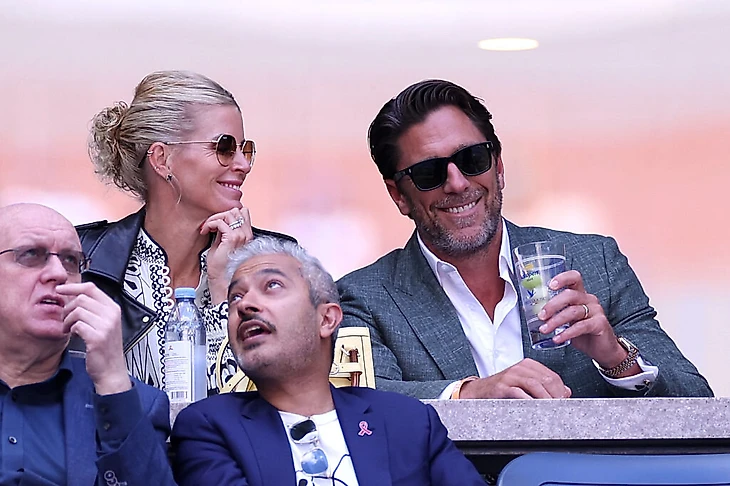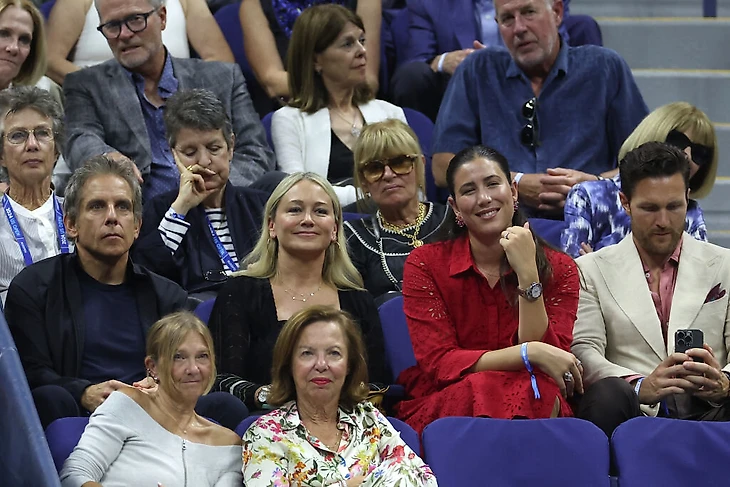 Бен Стиллер и его жена Кристин Тейлор оказались по соседству с Гарбинье Мугурусой. Она никогда в Нью-Йорке особо не блистала, но именно по итогам US Open в 2017-м стала первой ракеткой мира, а во время US Open в 2021-м встретила Артура Боржеса, с которым сейчас помолвлена (рядом с ней).