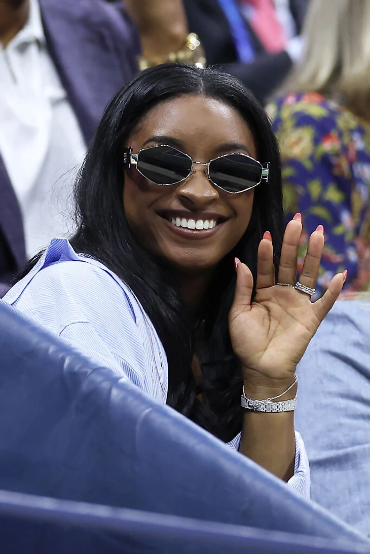 Симона Байлс отдыхает после Олимпиады, наблюдая, как соревнуются другие.