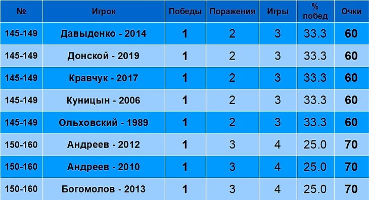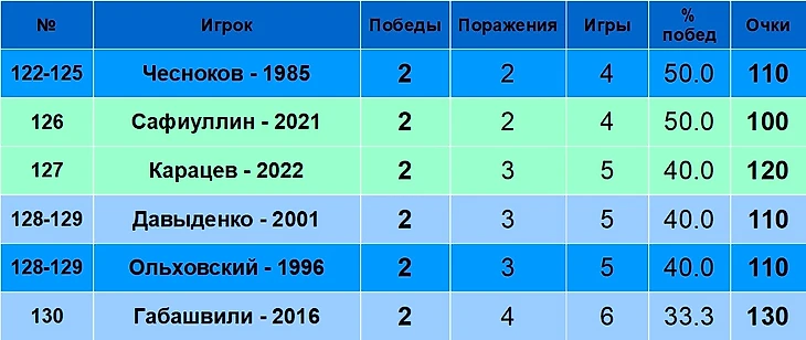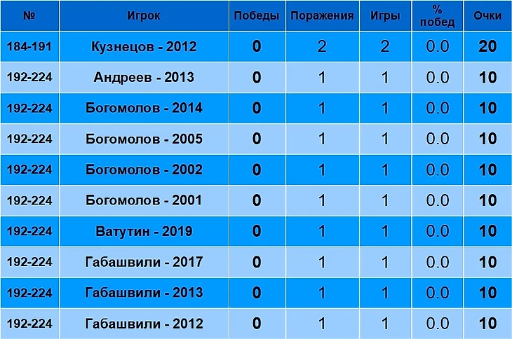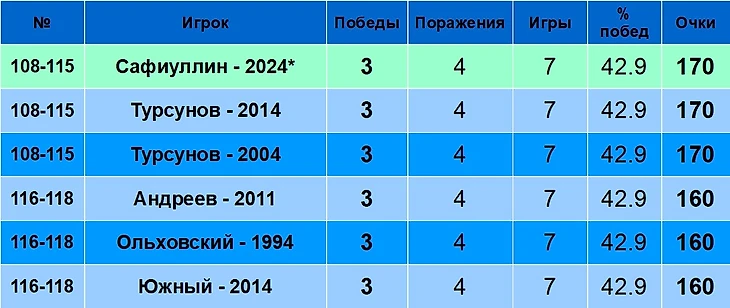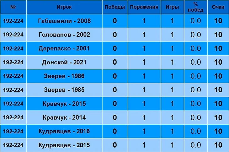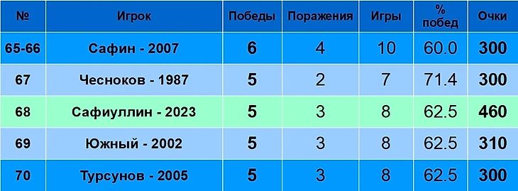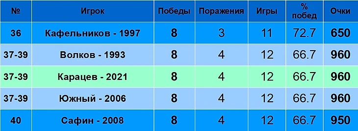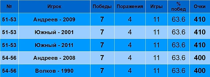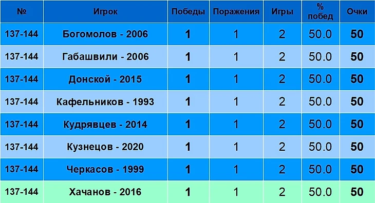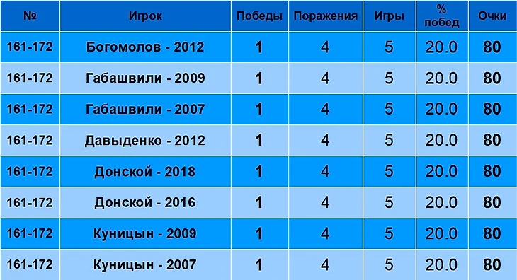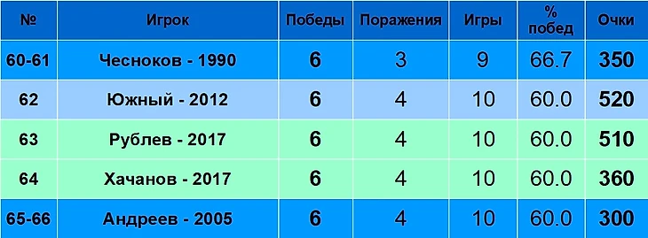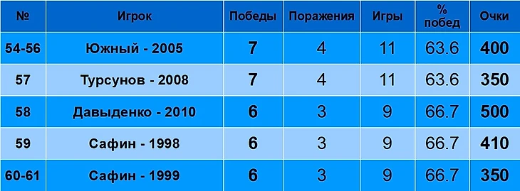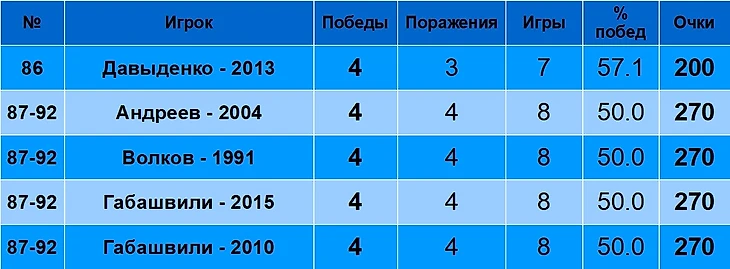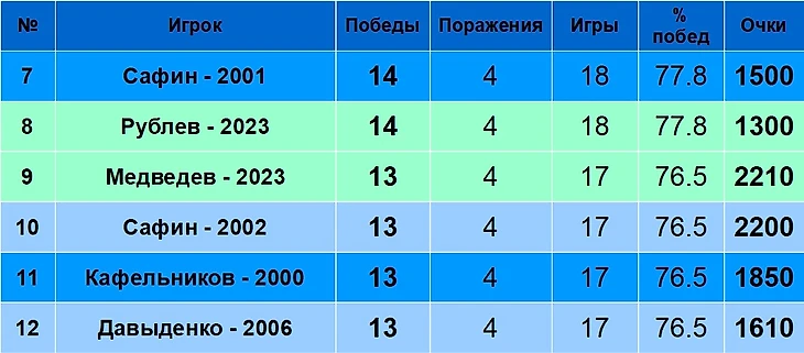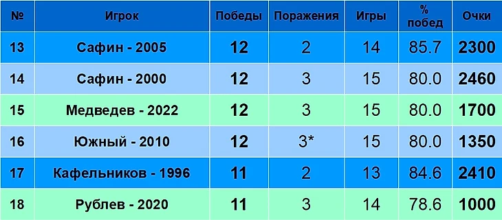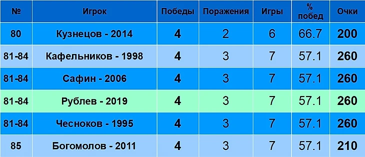Однако, все же взял ряд игроков с 1985 года и позже, которые после 1991 продолжали выступать за Россию: Чеснокова, Волкова, Ольховского, Черкасова, а также пару выступлений Зверева-старшего в 1985 и 1986 годах. Правда, отец текущей второй ракетки мира, в эти 2 сезона побед не набрал, поэтому, что он есть, что его нет, это особо не влияет на расположение игроков в таблице))