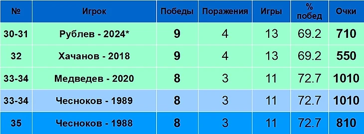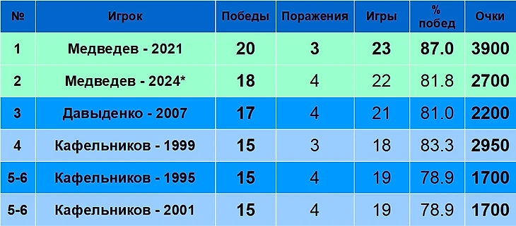 Всего 6 раз российские игроки одерживали 15 и более побед за сезон. Два лучших результата принадлежат Даниилу Медведеву.