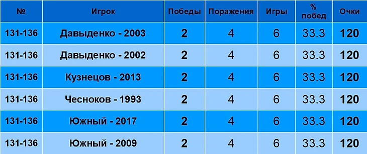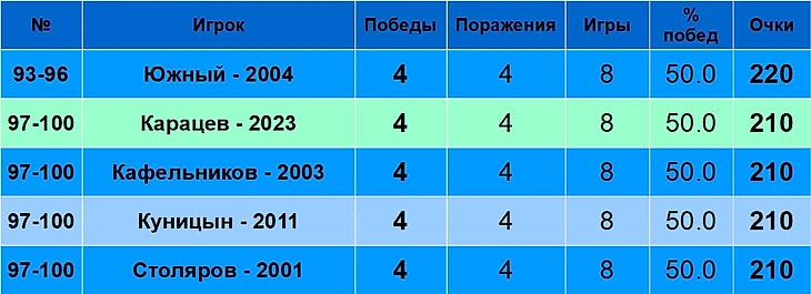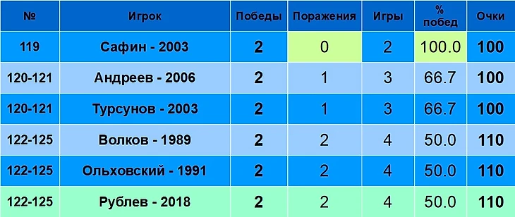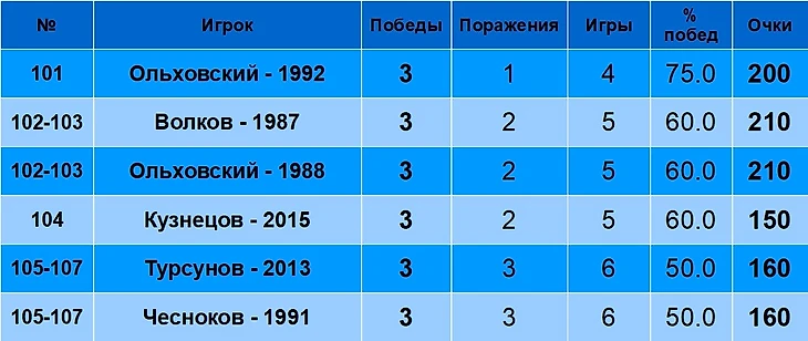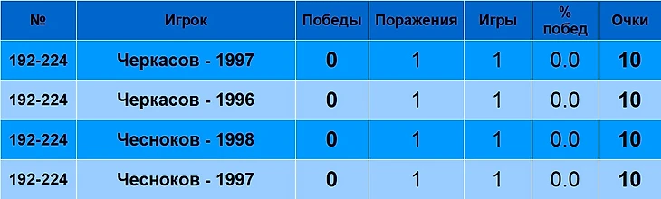 При равенстве побед, выше ставлю того игрока, у которого выше процент побед. Если процент побед тоже одинаковый, то, выше ставлю игрока, набравшего больше рейтинговых очков.
