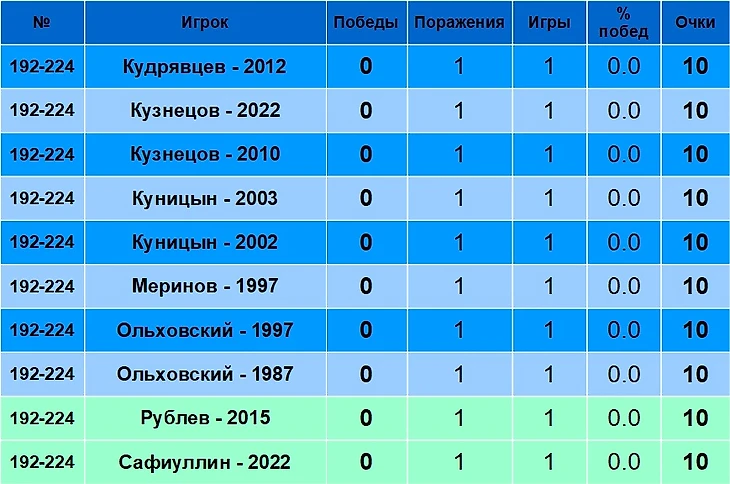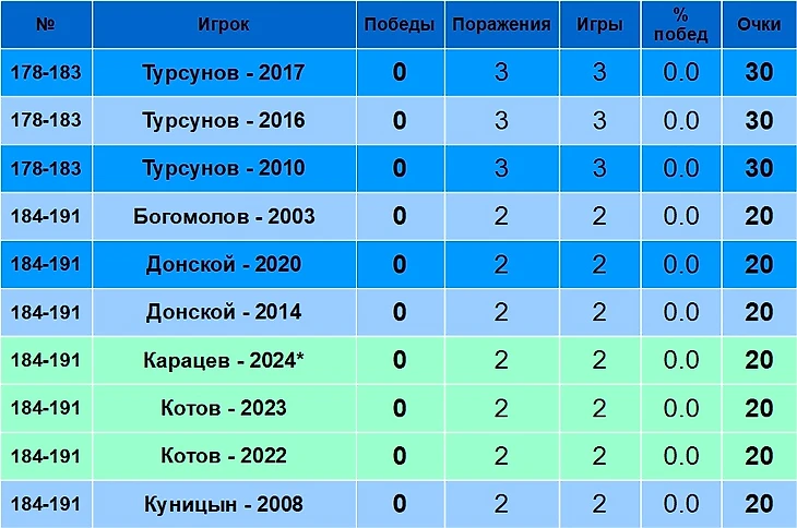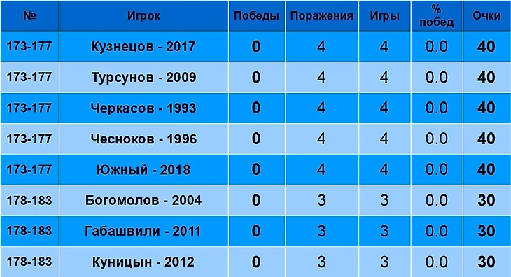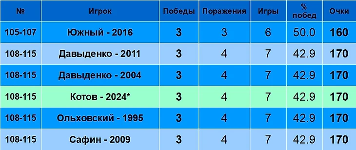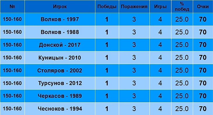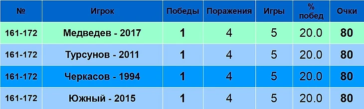 Иерархия последних 52 выступлений весьма условна и является лишь моим выбором. И 173 место и 224-ое имеют по 0 побед за сезон. Как их располагать, каждый может решать сам.