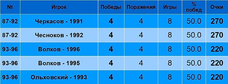 Я также не уверен, что период 1985-1991 стоило вносить в эту таблицу. Но, как-то странно было результаты Черкасова, Волкова, Ольховского, Чеснокова в период 1992-1999 учитывать, а их же чуть более ранние результаты - нет. Поэтому, пошел на компромисс.