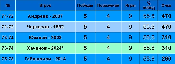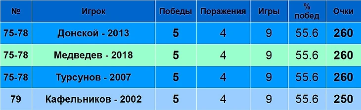 79 раз российские игроки одерживали 5 и более побед на Шлемах за год.