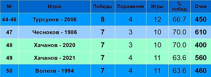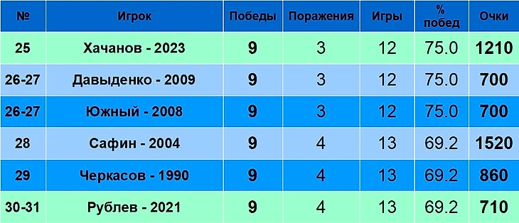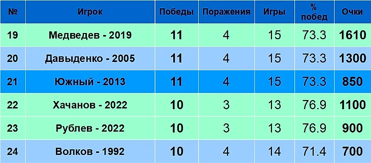 24 раза российские игроки одерживали 10 и более побед за год на Шлемах.