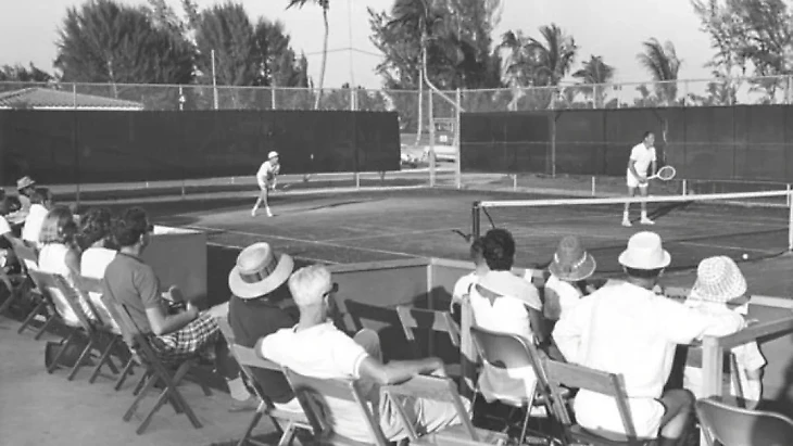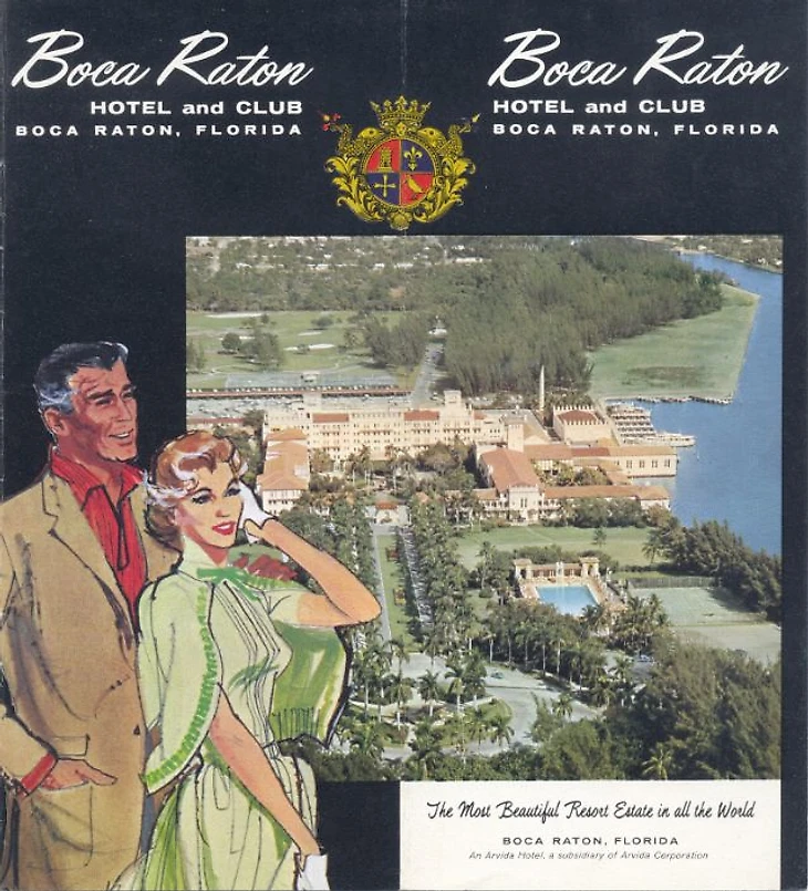 Первые два итоговых были, пожалуй, самыми скромными в плане организации, поскольку проводились на маленьких кортах без трибун в Бока-Ратоне. Город, который располагается во Флориде и даже сейчас не дотягивает до 100 тысяч населения, стал популярным курортом еще в 1920-х - как раз благодаря отелю Boca Raton Hotel & Club, где девушки потом и боролись за трофей вместе с $25 000 призовых. Такой вид открывался на него в середине 1960-х, как показано на брошюре.