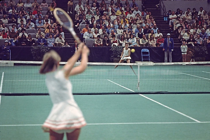 А вот фото с корта, снятое во время финального матча между Ивонн Гулагонг и Крис Эверт в 1976-м. Австралийка тогда взяла свой второй кубок за три сезона, не дав сопернице защитить титул 1975-го.