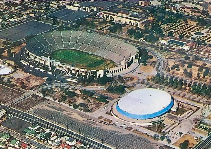 С 1974 по 2000 годы женский итоговый проходил исключительно на ковре, и первым местом была Мемориальная спортивная арена Лос-Анджелеса (Los Angeles Memorial Sports Arena), вмещавшая на матчах 14 800 зрителей. Она находилась рядом с огромным Мемориальным колизеем Лос-Анджелеса - знаменитым стадионом, который в 2028-м третий раз в истории примет олимпийские соревнования. Вот такой вид сверху открывался на обе арены примерно в 1970-м.