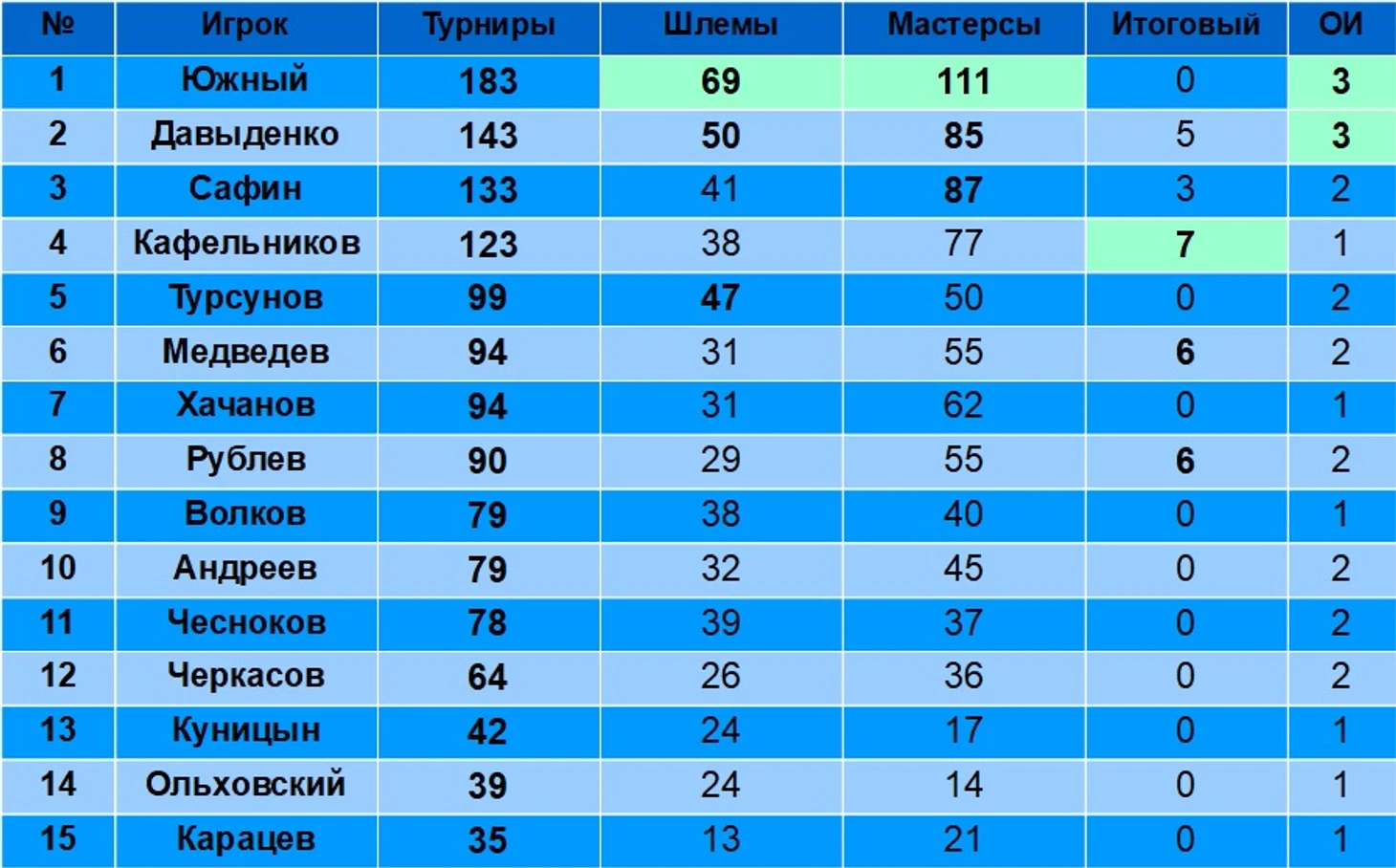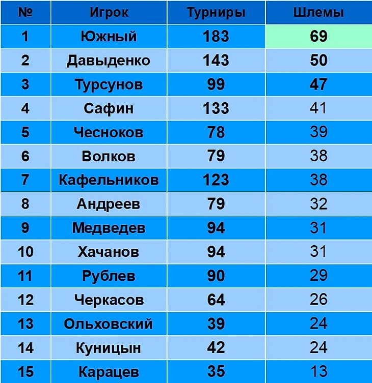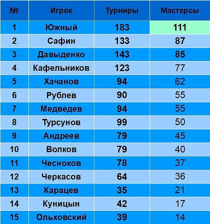 У Южного за долгую карьеру и больших турниров больше всех россиян – 183. И мелких турниров сыграл больше всех.