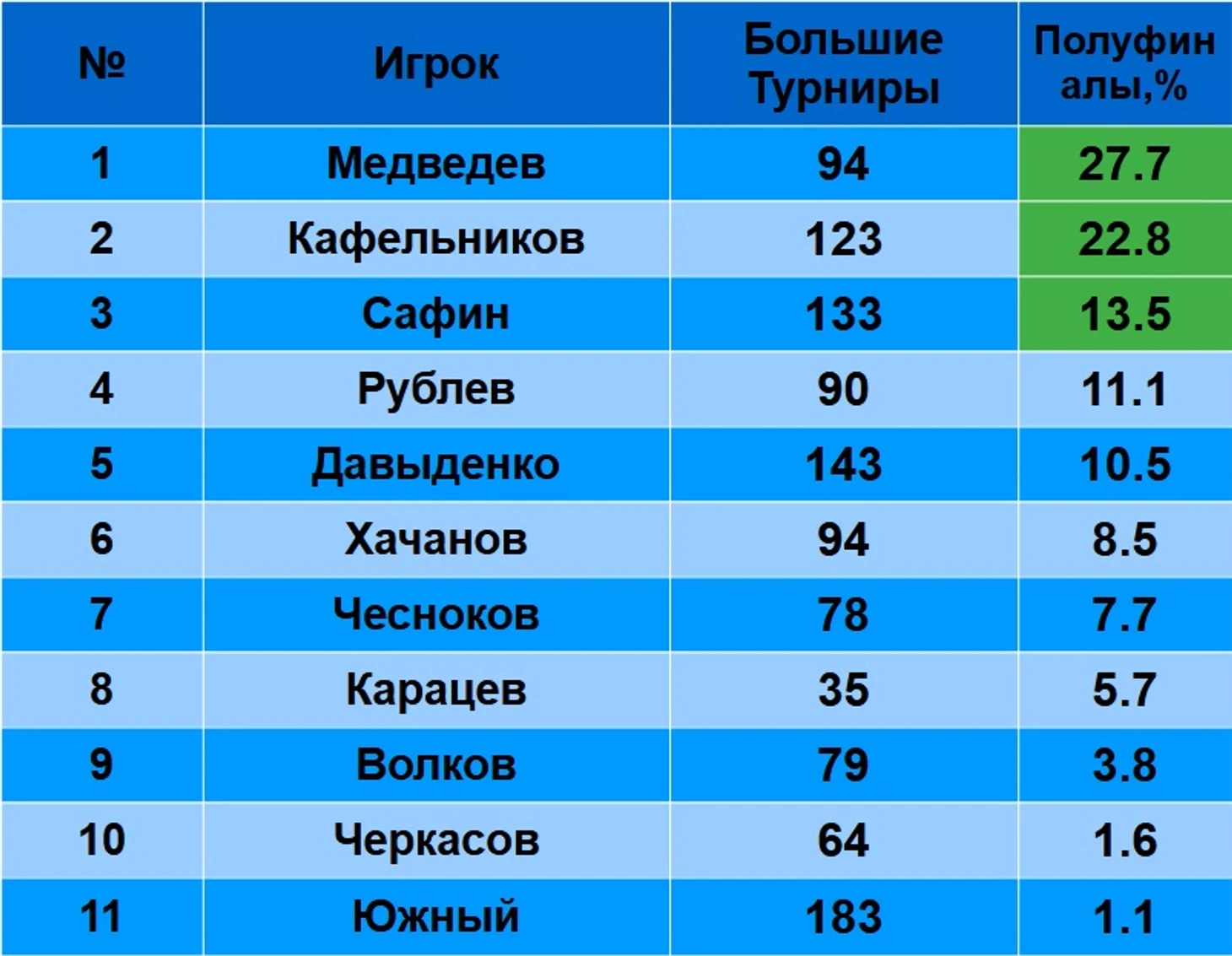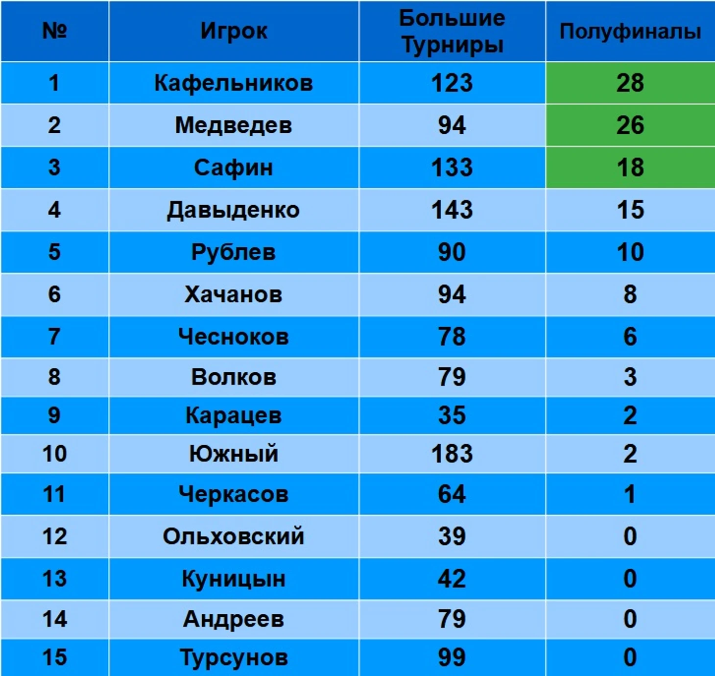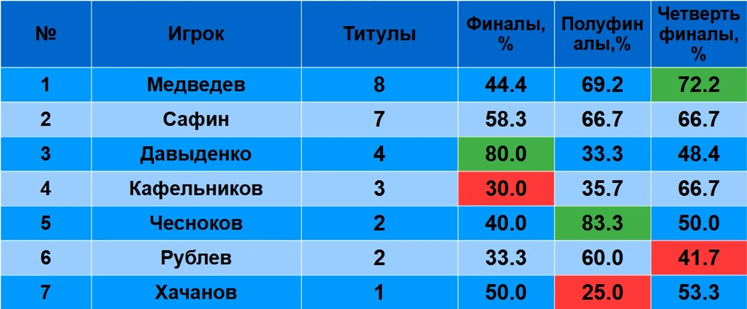 На стадии полуфинала хороши Чесноков(5 побед из 6), Медведев(18 из 26), Сафин(12 из 18), Рублев ( 6 из 10). Плохо играли Кафельников(10 из 28), Давыденко( 5 из 15) и Хачанов(2 из 8).