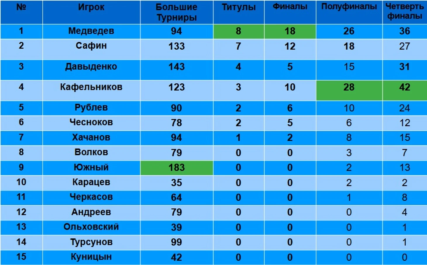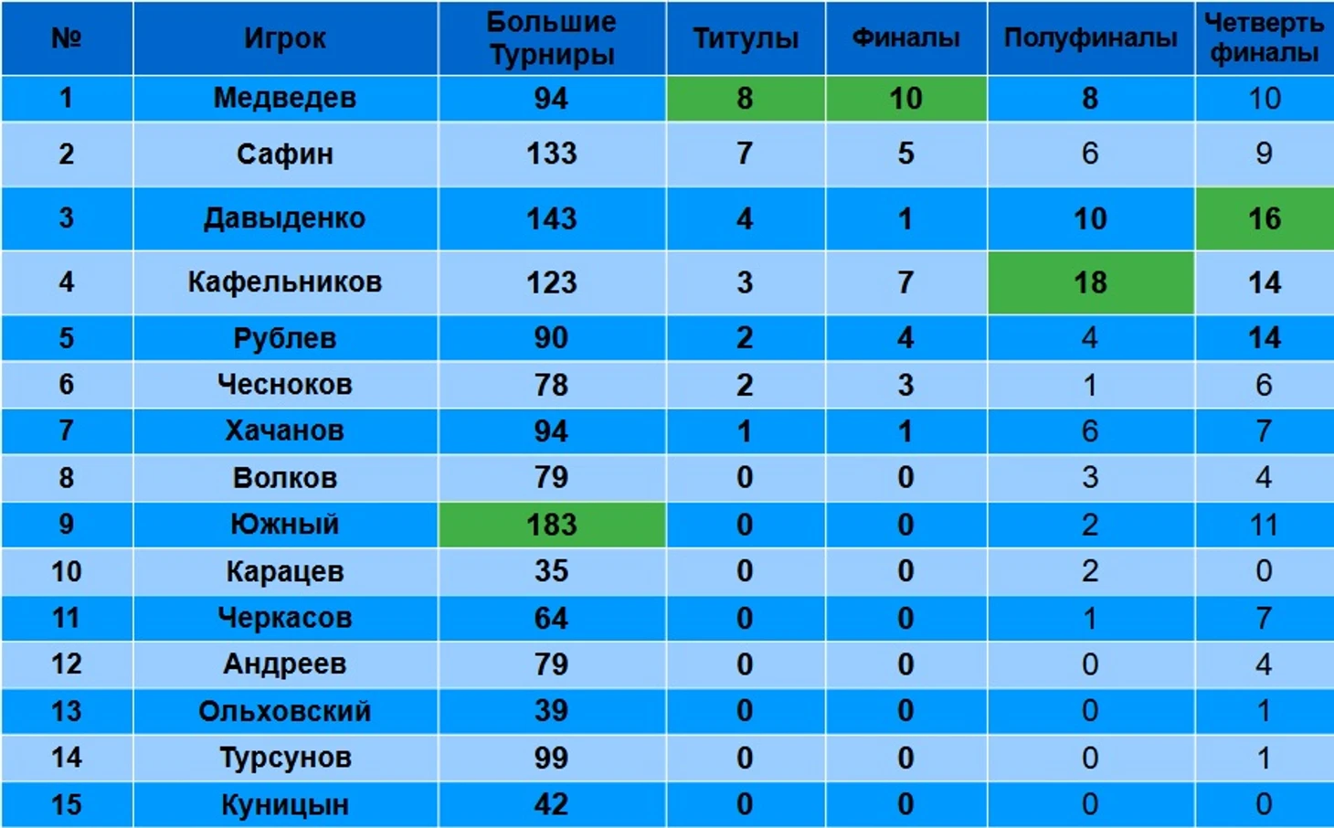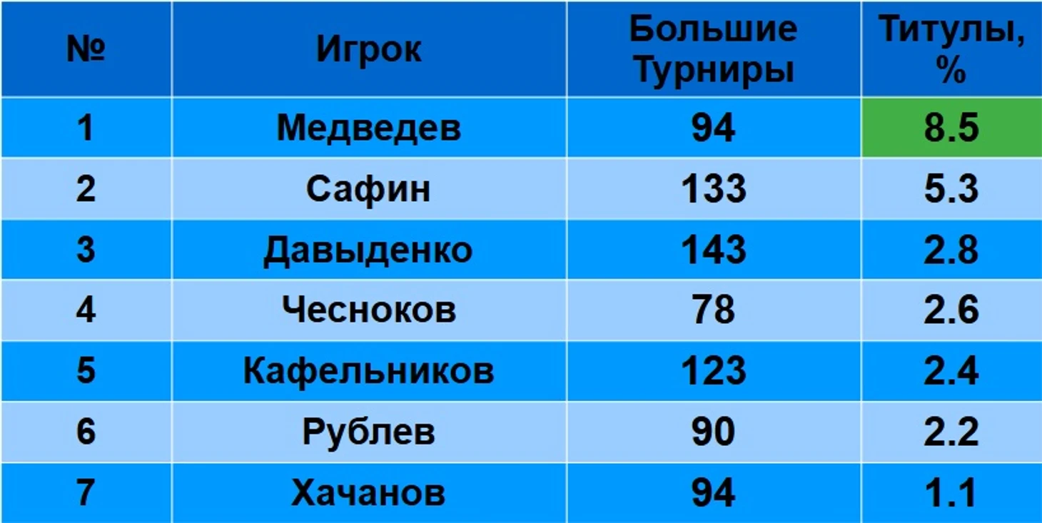 Беру те же 15 россиян, что и в предыдущей статье(https://www.sports.ru/tennis/blogs/3303563.html), которые хотя бы раз брали титул, пусть даже на турнире категории 250. Поэтому, условный Котов или Сафиуллин пока в статистике не присутствует.
