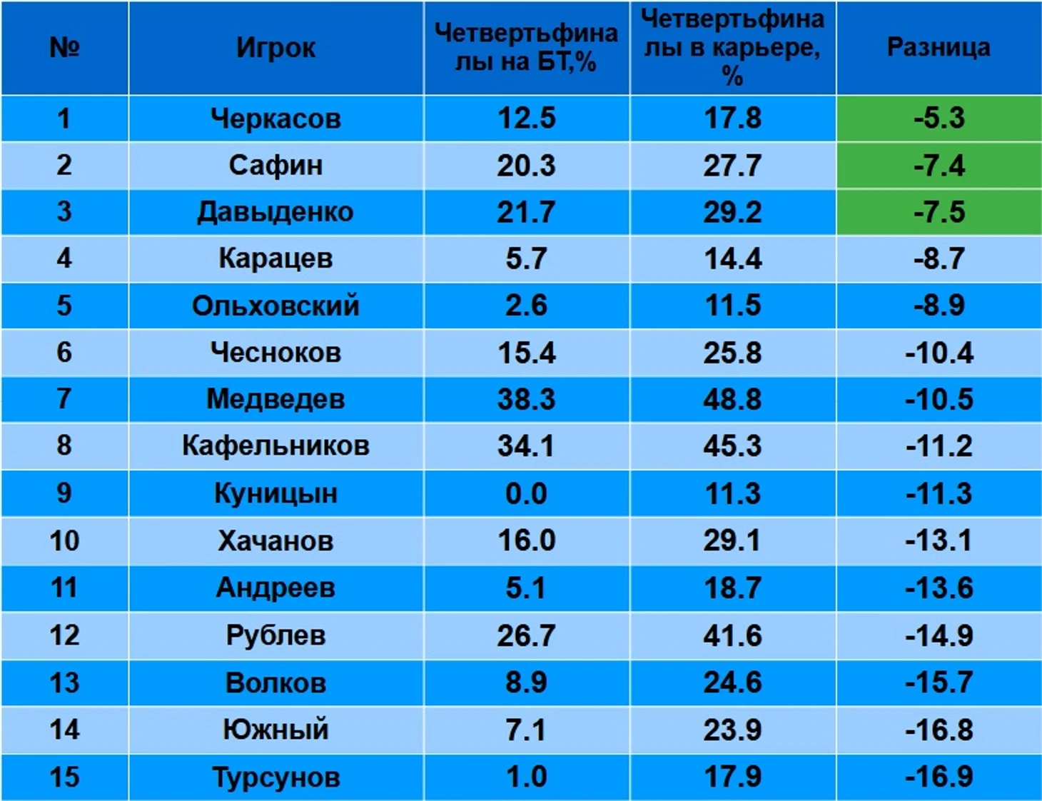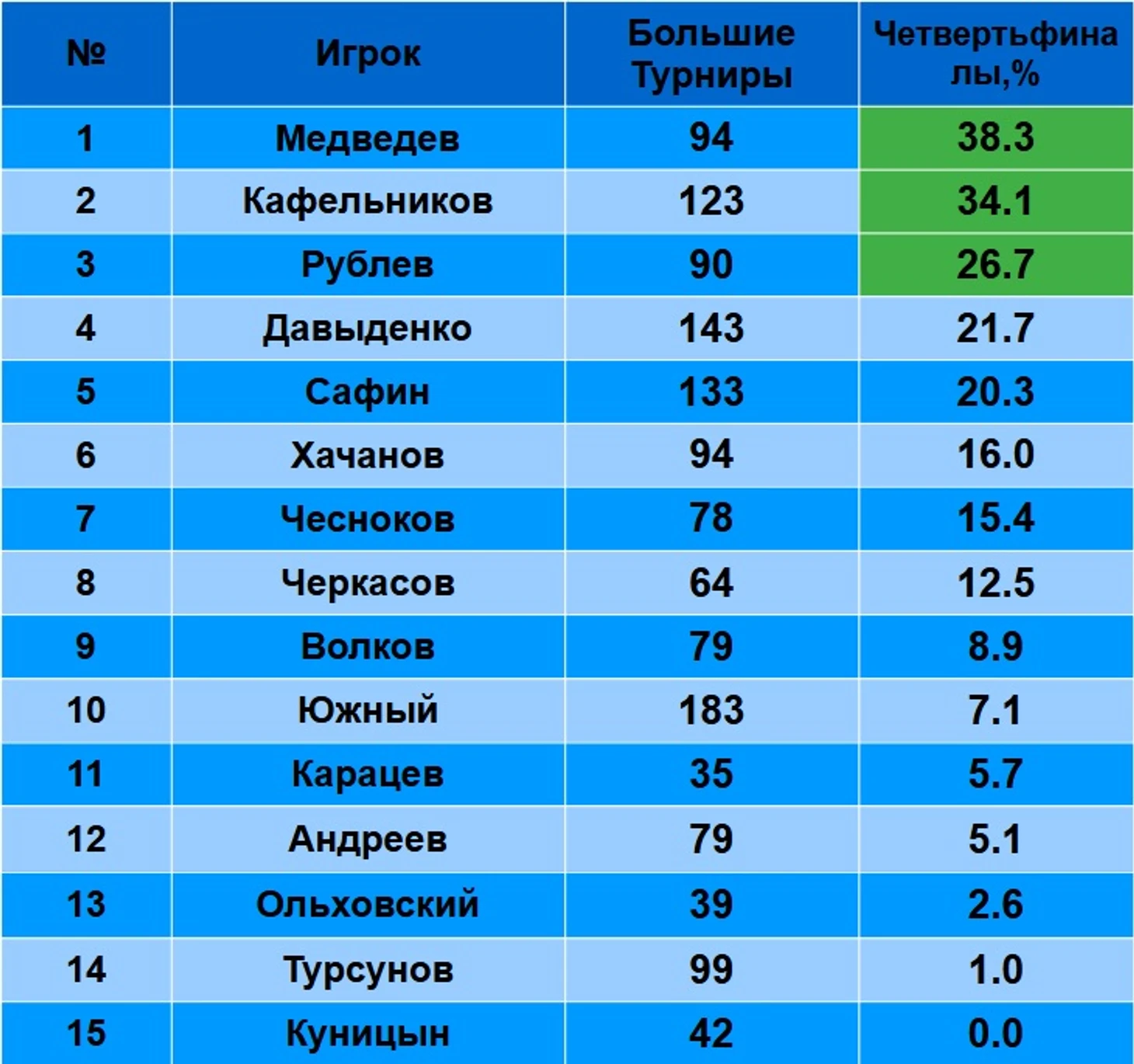 Везде, лидер – Медведев. Что показывает, что на высшем уровне тенниса – именно он самый стабильный игрок российского тенниса. Но, есть несколько «но». Сможет ли Даниил и дальше удерживать такой процент? Или, по мере старения, процент начнет сильно падать?