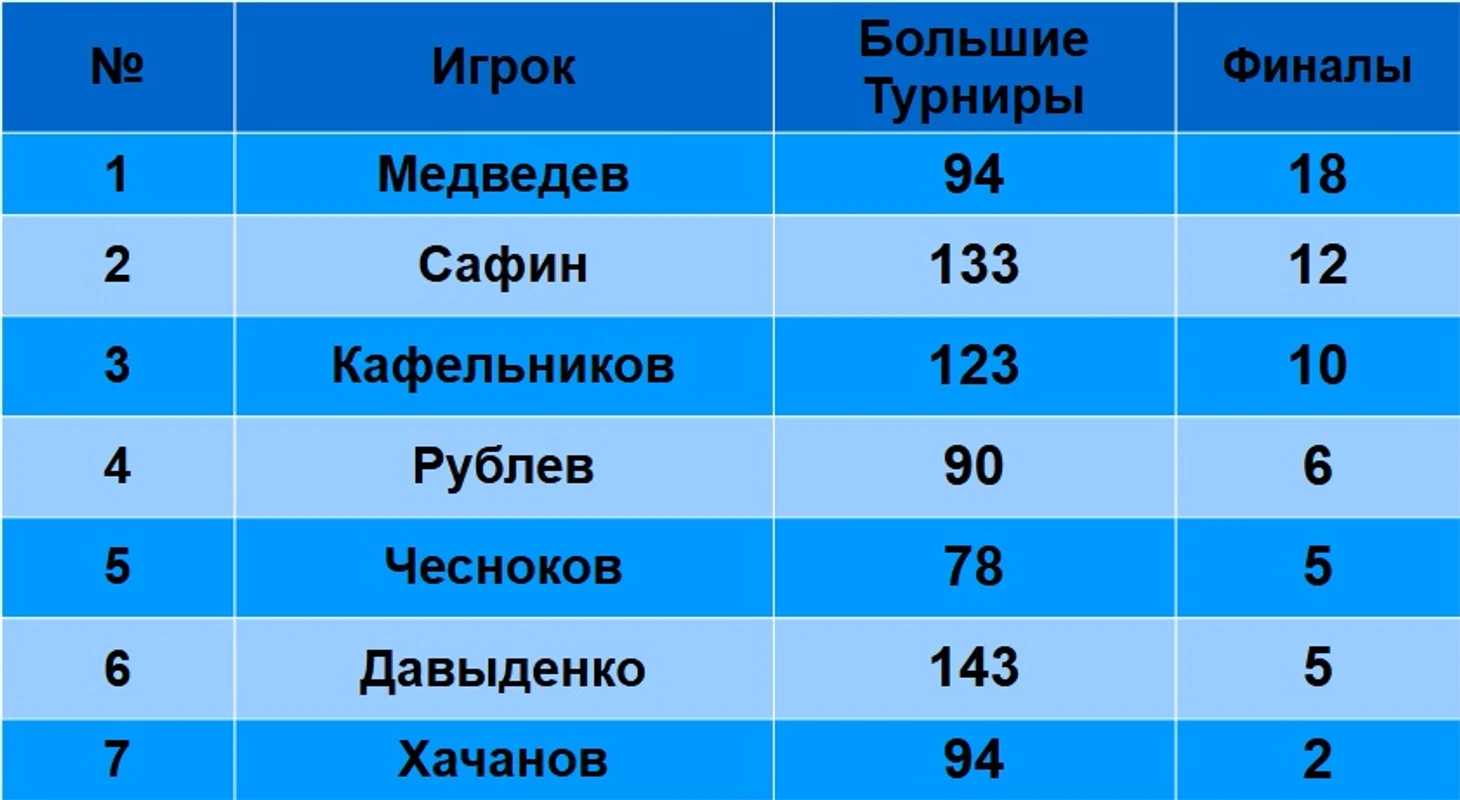 Давыденко, Хачанов, Рублев – более «обычные» игроки. В основном брали турниры категории 250-500, «большие» победы – редкость.