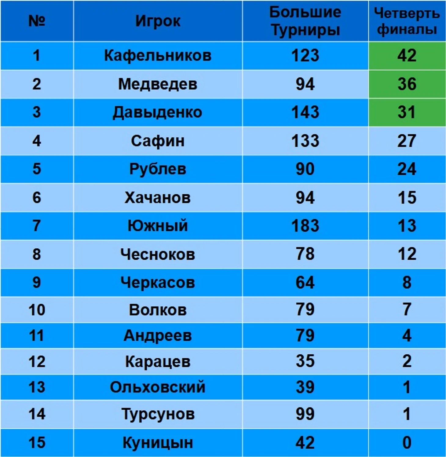 1-7 места выходили в финалы и брали титулы, 8-11 выходили в полуфиналы, 12-14 место были в четвертьфиналах. Куницин ни разу не был даже в четвертьфинале. В принципе, можно также упомянуть Сафиуллина с четвертьфиналом Уимбилдона, однако, особо картину он не изменит…