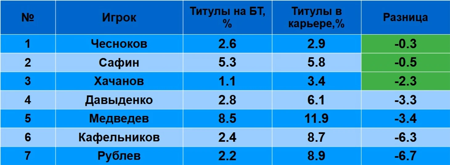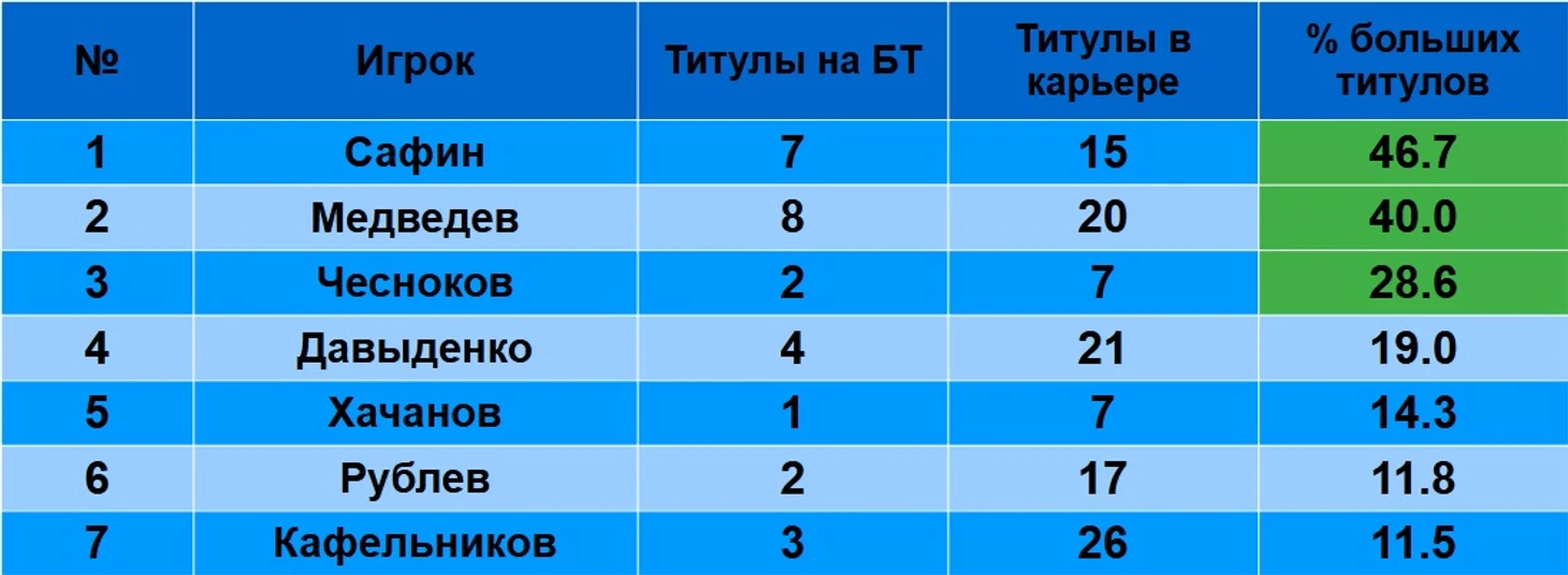 Впрочем, ради интереса посчитал долю «больших титулов» среди общего числа титулов игрока.