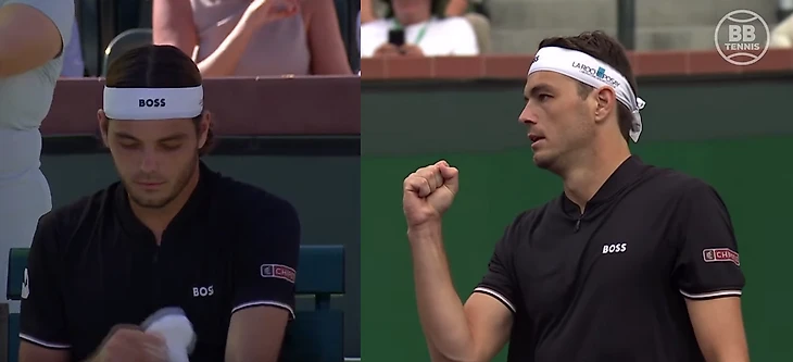 А причина неудачи Фрица очевидна – он постригся по ходу турнира. Слева он в победном матче с Алехандро Табило, справа – в среду, уже с короткими волосами.