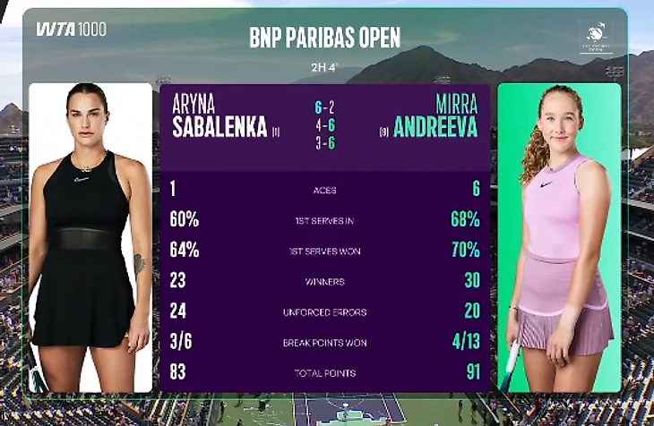 В этом году Мирра встречалась с Соболенко уже третий раз, и в двух предыдущих матчах она взяла пять геймов и три гейма. После первого сета казалось, что примерно такой же итог повторится и здесь.