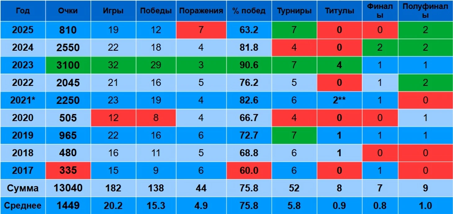 Лишь 6-ое место по очкам из 9 сезонов. Причем, отставание от первых четырех сезонов: 2021-2024, очень большое. Хуже было лишь на заре карьеры Медведева: в 2017-2018, и в ковидном 2020.
