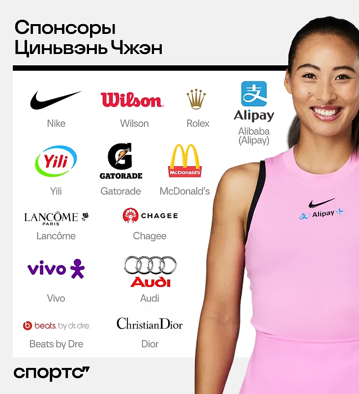 Большие спонсоры пришли к Чжэн еще до победы на Олимпиаде и финала Australian-2024. Уже в 2022-м, по итогам которого Циньвэнь стала новичком сезона WTA, она подписалась с Rolex и компанией Ant Group конгломерата Alibaba, став лицом их продукта Alipay – крупнейшей в мире мобильной платежной системы (заплатили за патч на игровой форме Циньвэнь – бонус среди клиентов Nike довольно редкий и дорогой). До конца года спонсором Чжэн стала также крупнейшая китайская молочная компания Yili.