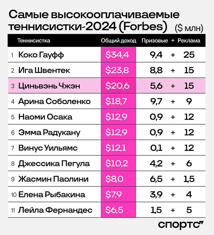 За 2024-й китаянка заработала $20,6 млн и уступает только Коко Гауфф и Иге Швентек.