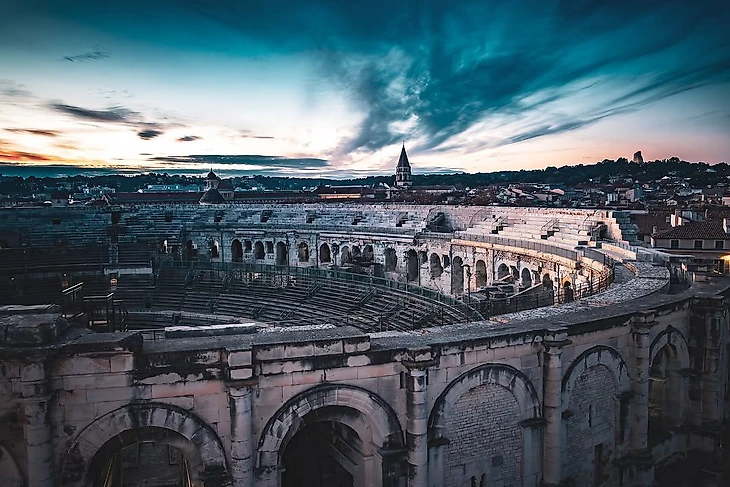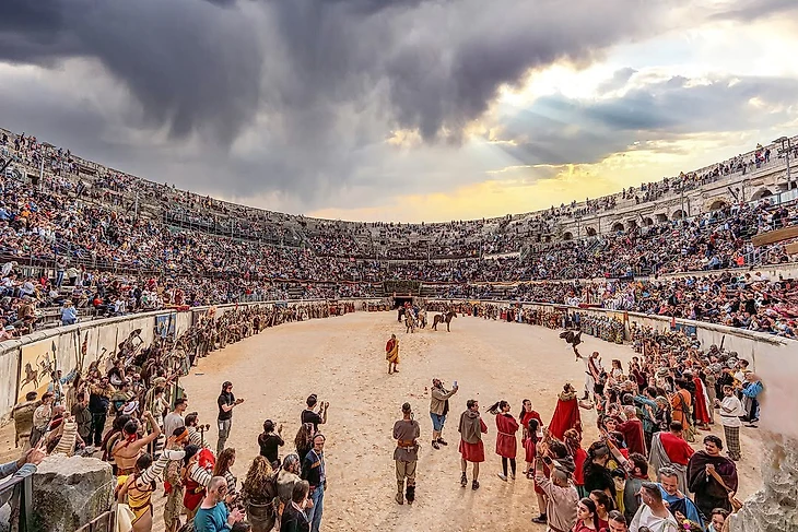 За две тысячи лет амфитеатр побывал ареной гладиаторских боев, крепостью и даже городом в городе (до конца XVIII века в его стенах были жилые дома, рынки, церкви), в последние полтора века там проводят камаргские бега (на полудиких лошадях из французской области Камарг), корриды, исторические реконструкции, концерты.
