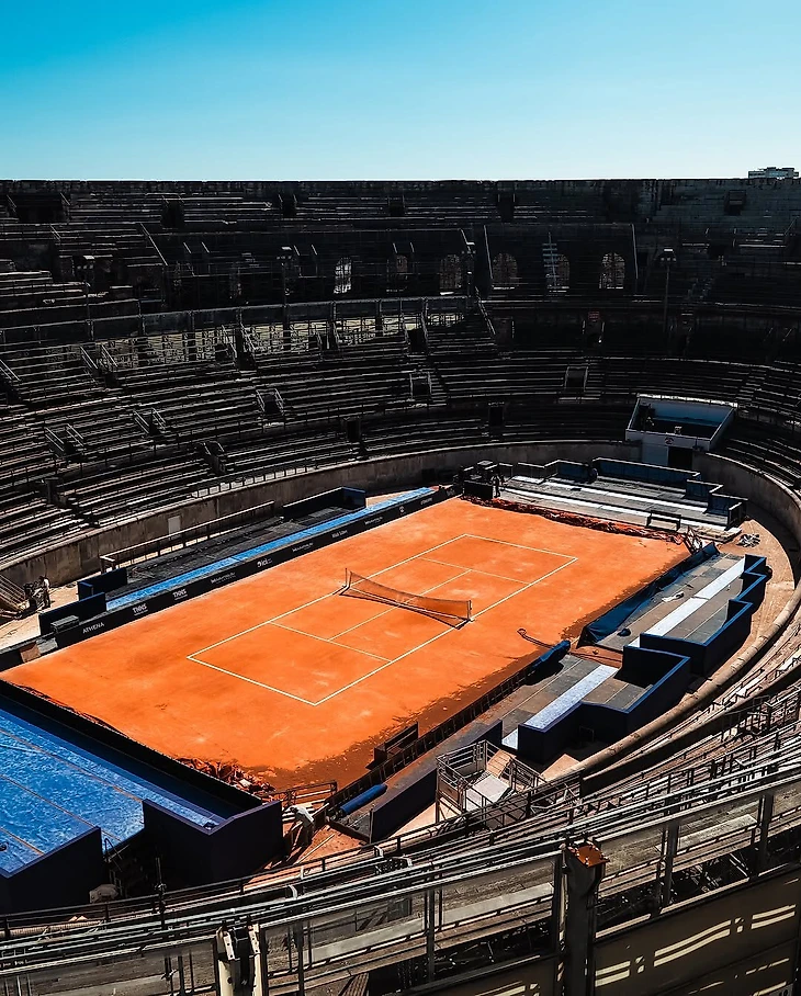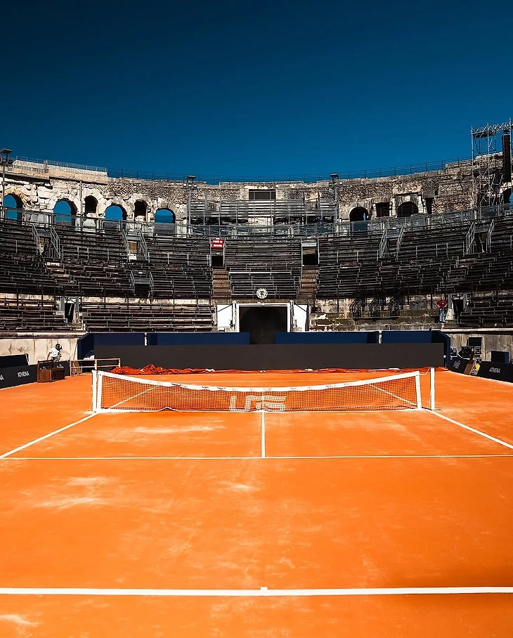 Турнирный корт оборудовали в античном амфитеатре, построенном в I веке н.э. вскоре после римского Колизея по его образцу (но в два с лишним раза его меньше) и вмещавшим 25 000 человек. Из 400 существующих сейчас римских амфитеатров нимский – один из наиболее сохранившихся и один из 20 крупнейших.