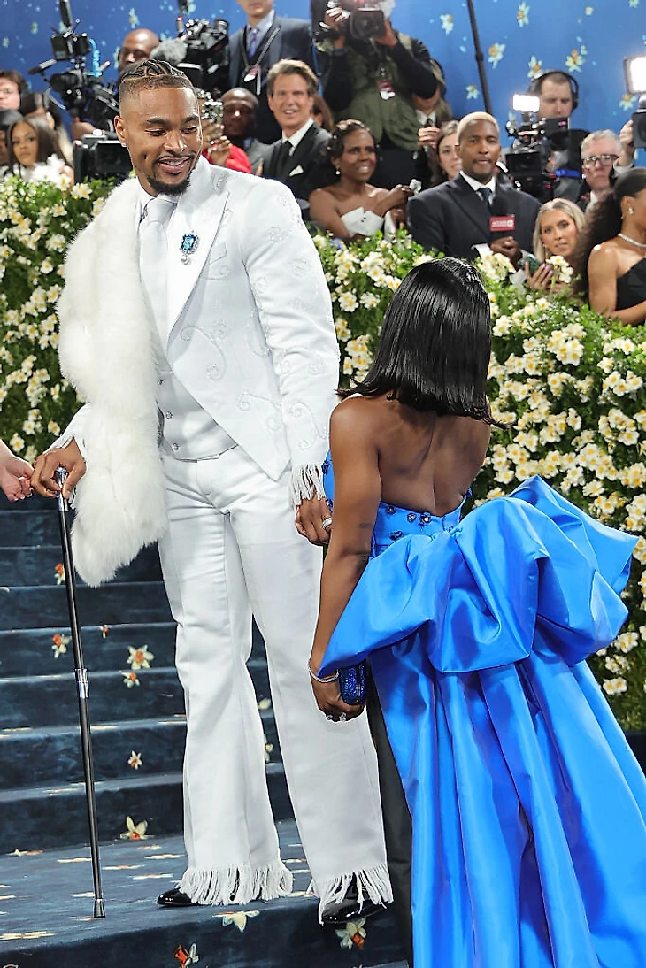 Симона Байлс пришла в независимом бренде Harbison, ее муж футболист Джонатан Оуэнс – в белом костюме с бахромой, вышивкой, мехом, брошью и тростью: