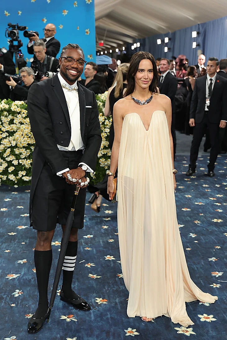 Еще один олимпийский чемпион спринтер Ноа Лайлс в Thom Browne с ювелиркой Аной Хоури, чьи жемчужные украшения также на нем.