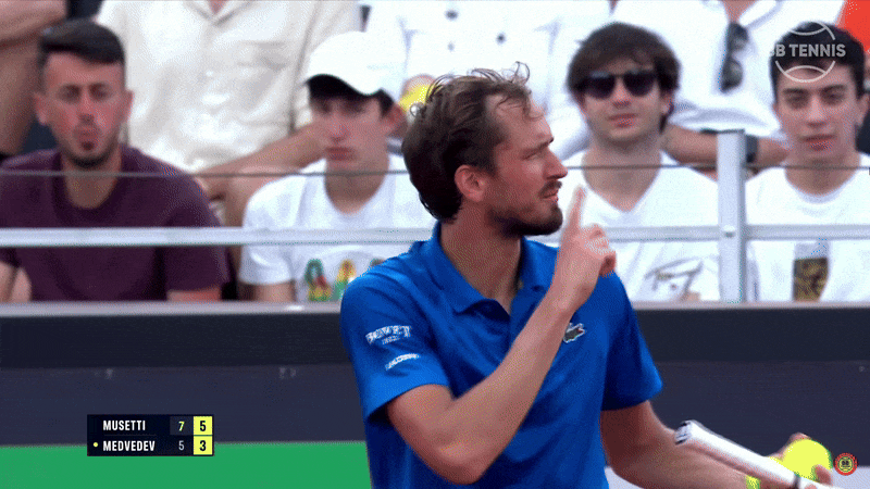 После возобновления прошел ровно один розыгрыш: Даниил принял вторую подачу, пассивно держал мяч, дал Музетти забежать под право – и получил навылет. Все это заняло секунд 30.