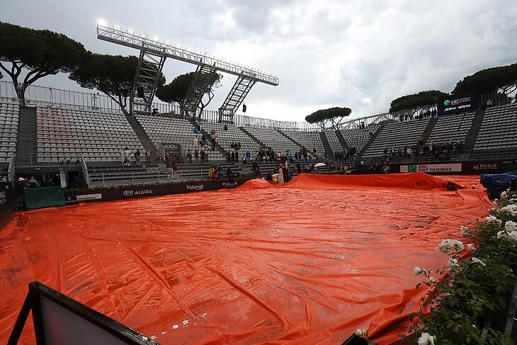 Матч прервали при счете 5:4 и 40:30 в пользу Музетти – на матчболе. На грунте можно играть в мелкий дождь, но тут так поливало, что судьи решились на крайнюю меру.