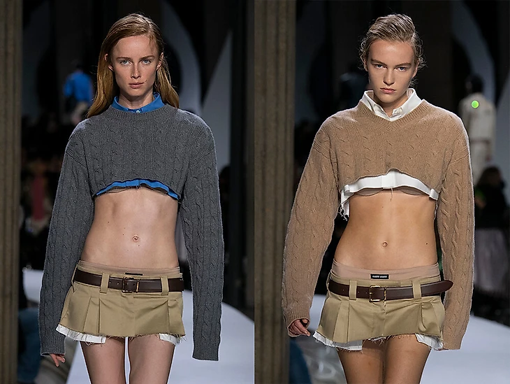 В 2010-е на острие модной повестки Miu Miu потеснили бренды с более свежими эстетиками (Céline Фиби Файло, Balenciaga Демны, Gucci Алессандро Микеле), но потом у марки случился ренессанс. В октябре-2021 Miu Miu в рамках весенне-летней коллекции-2022 показали очередной твист не то на школьную, не то на офисную форму – 20-сантиметровую мини-юбку с торчащими снизу карманами, а сверху – трусами и такие же рубашку и свитер с выглядывающим из-под них бюстгальтером.