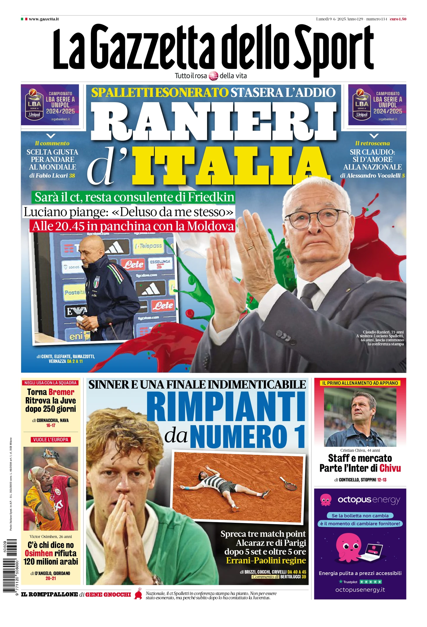Итальянцы настроили оптику на Синнере. Но на первый план все же поставили потенциальный приход в футбольную сборную Клаудио Раньери.