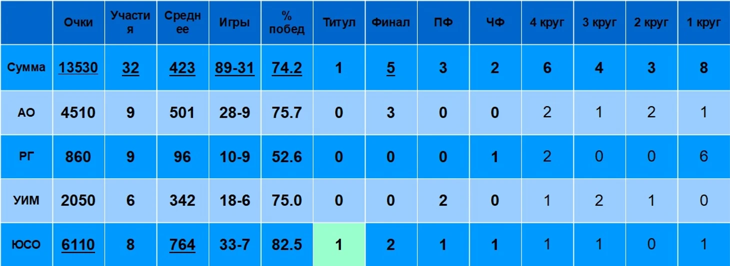 Рублев очень ровный игрок. По среднему набору очков колебания на разных Шлемах от 142 до 236 очков, по проценту побед: от 64,3 до 72,7. Все рядом, все близко. Средний набор очков за карьеру на турнире – 191 очко, чуть хуже 4 круга в среднем(200).