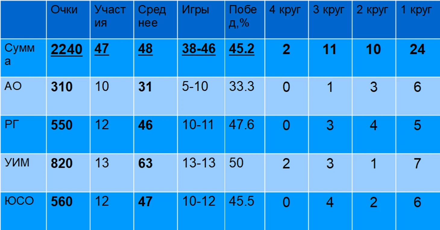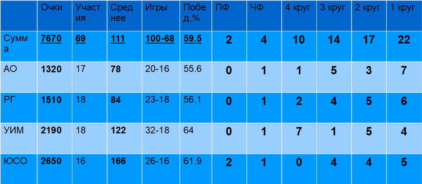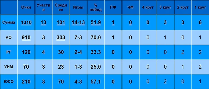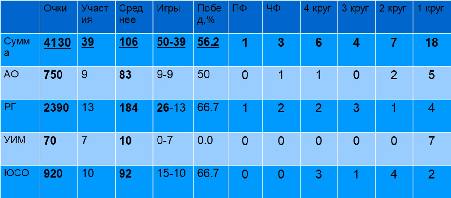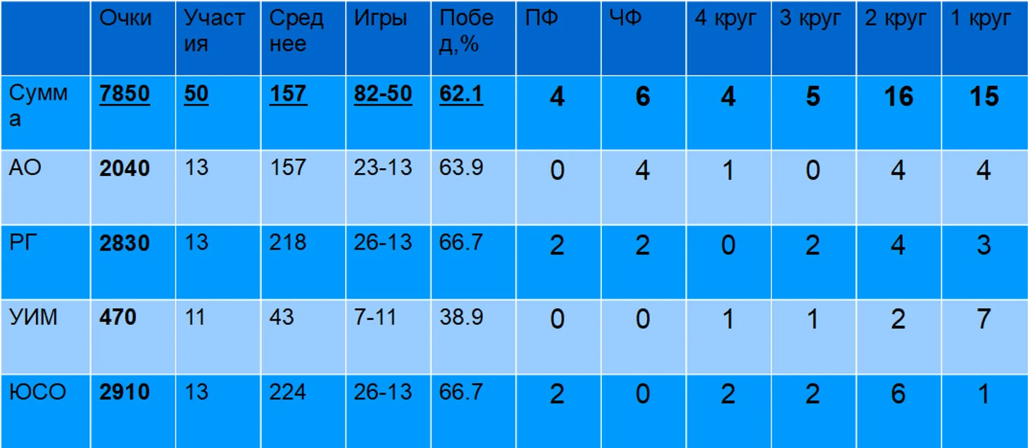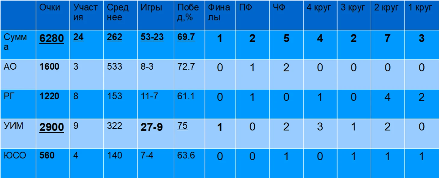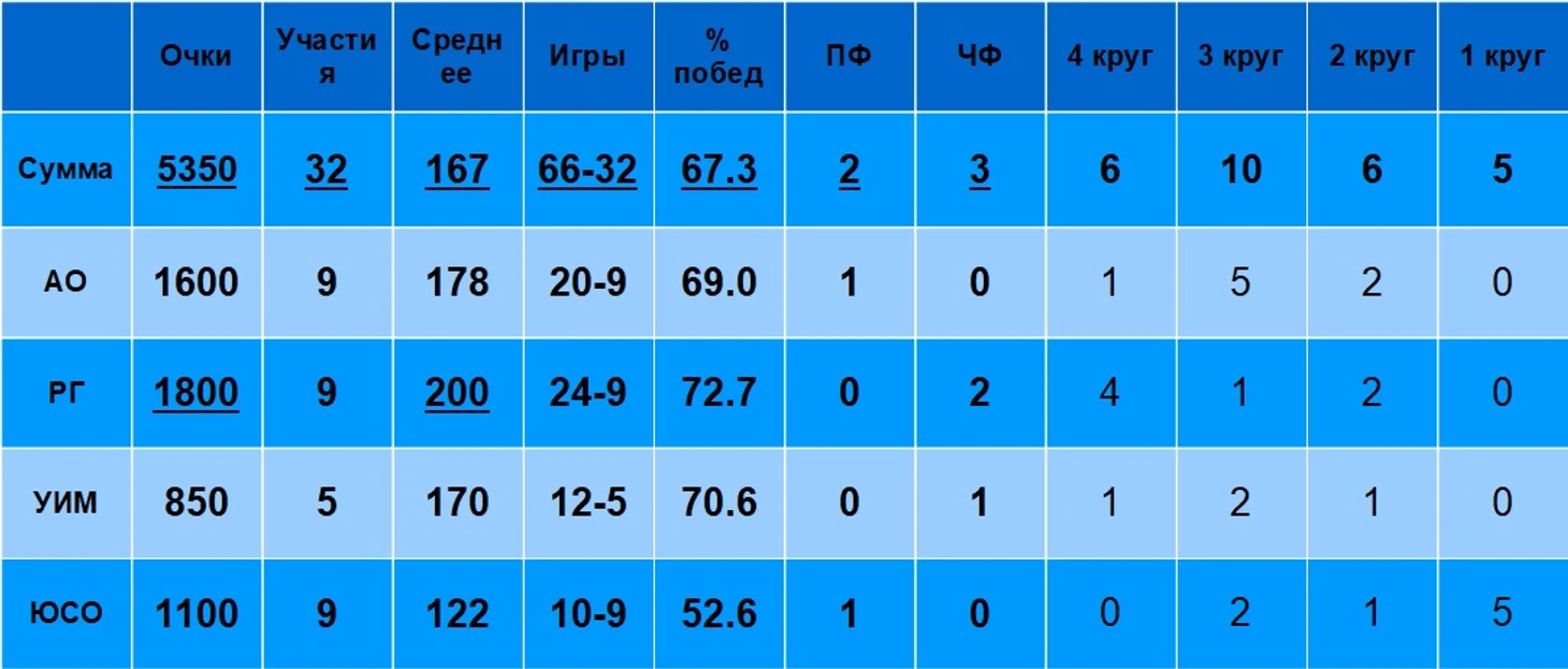 Лучший Шлем: РГ – 2390 очков, 184 очков в среднем, 26 побед, 66,7% побед.
