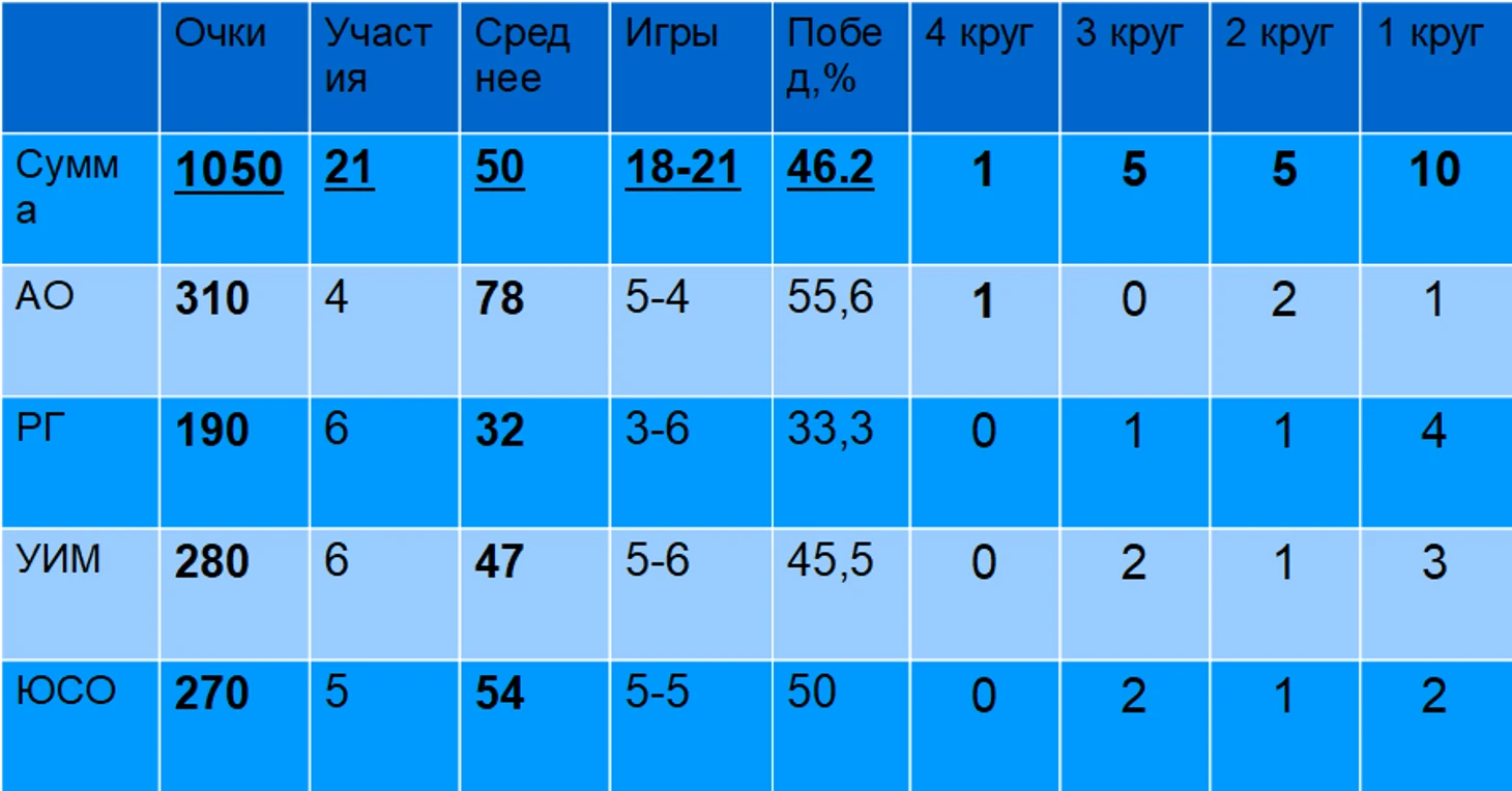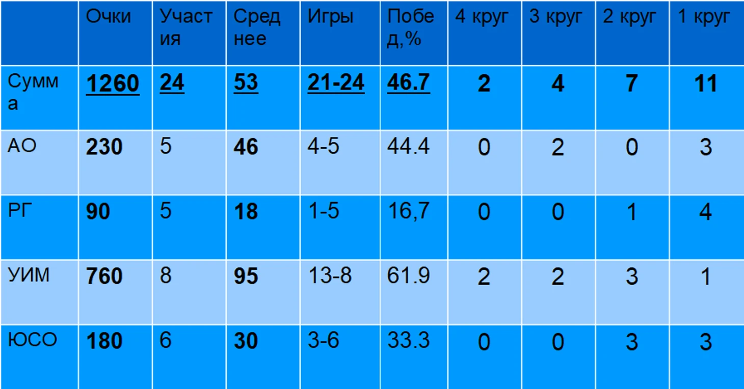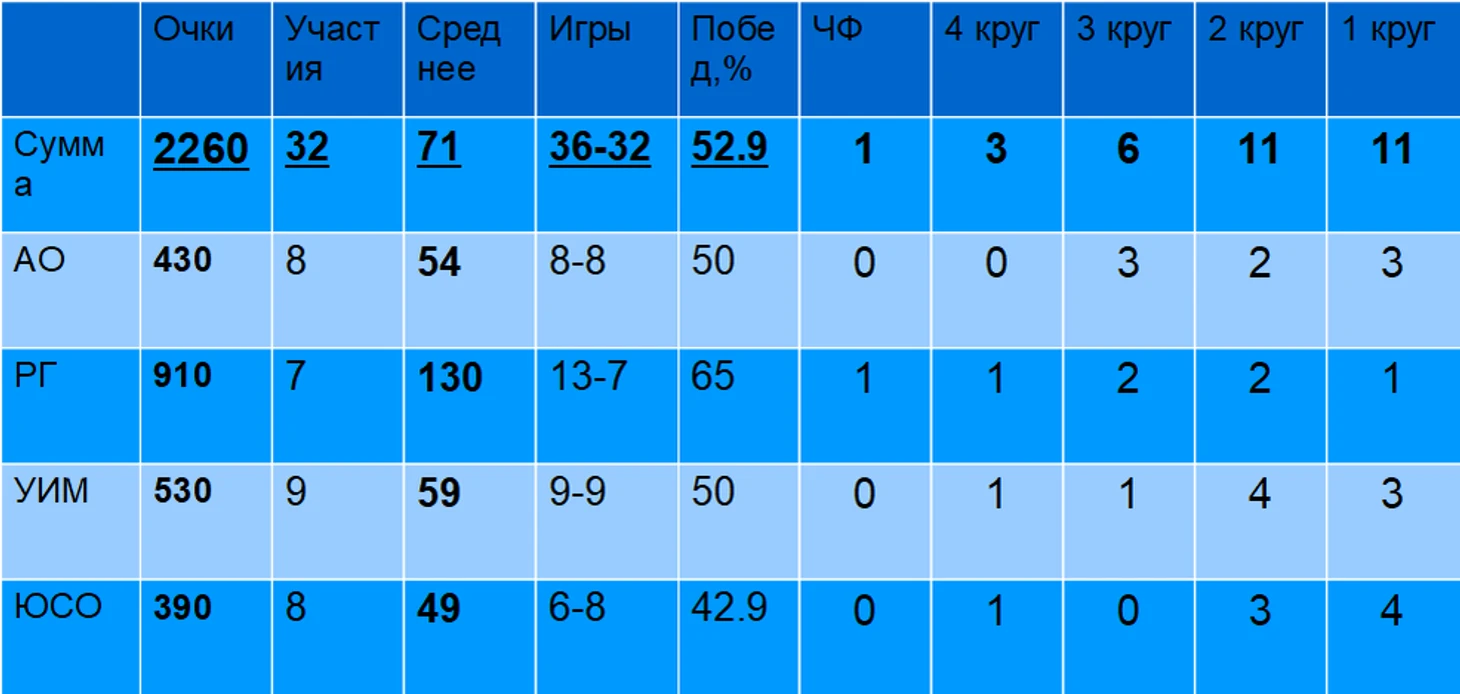 Худший Шлем: РГ – 350 очков, 39 очков в среднем, 6 побед, 40% побед.