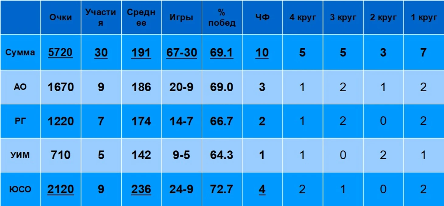 11)Игорь Андреев – 2260 очков. Среднее – 71 очко за турнир.