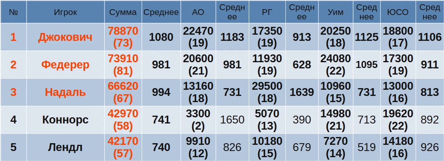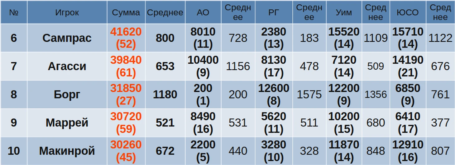 Федерер – 73910, Сампрас – 41620, Маррей – 30730,