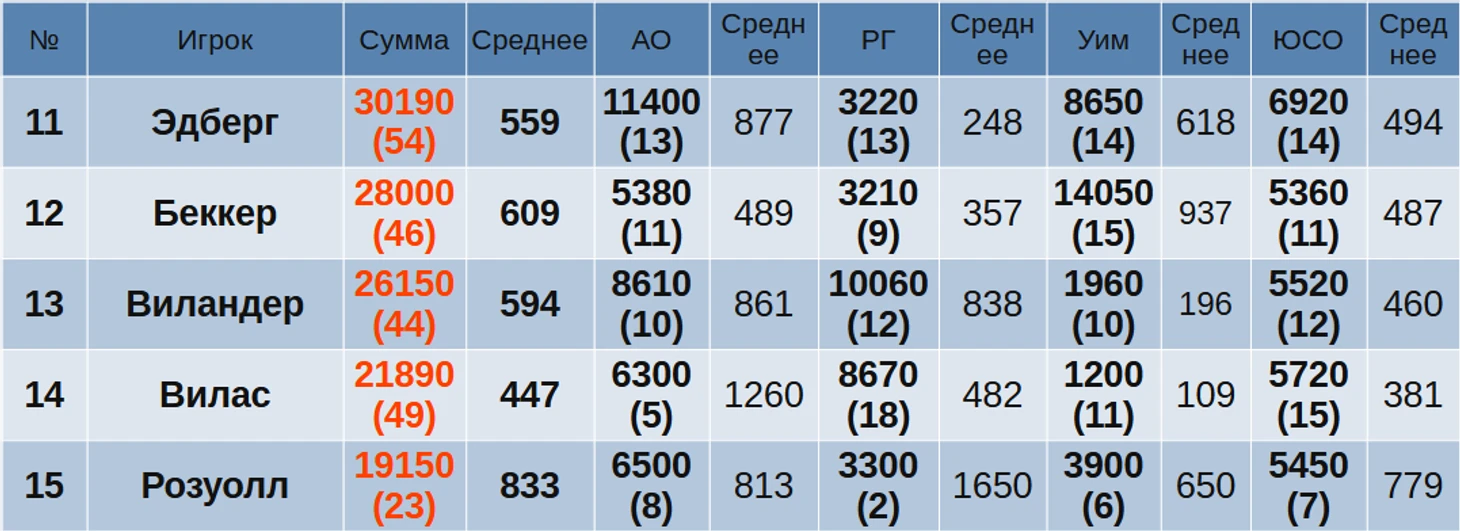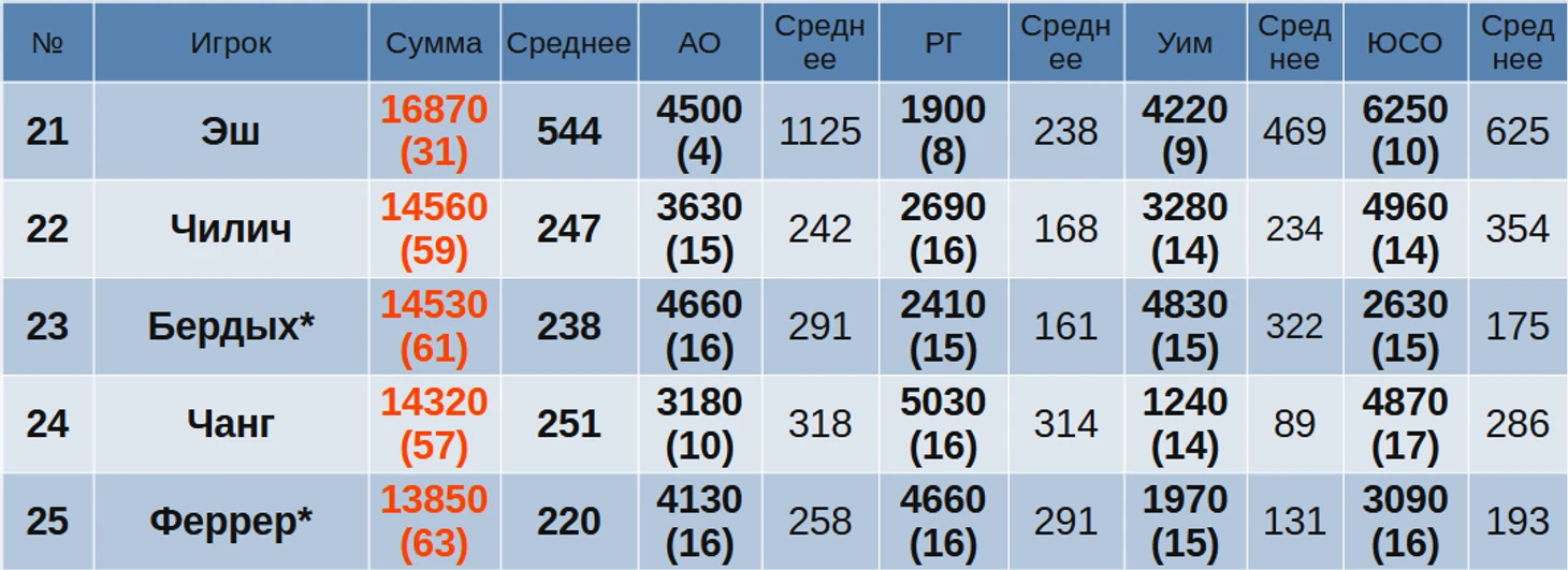 Дель Потро – 11330, Ферреро – 11240, Тим – 10370..