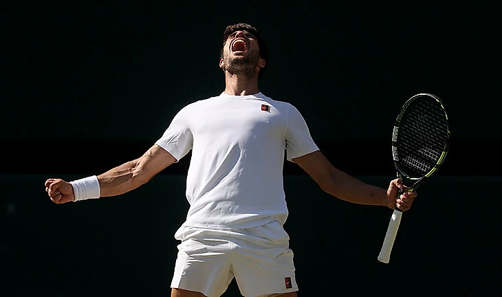 В полуфинале «Уимблдона» Алькарас выиграл 24-й матч подряд и 20-й подряд – на турнире. Он обыграл чемпиона двух травяных турниров сезона Тэйлора Фрица, который провел очень даже хороший матч, – 6:4, 5:7, 6:3, 7:6. На тай-брейке у американца был двойной сетбол, после чего в четырех следующих розыгрышах Фриц подал первым мячом, отлично принял подачу Алькараса, плотно принял подачу Алькараса и снова подал первую. Все эти очки, а с ними и матч Фриц проиграл.