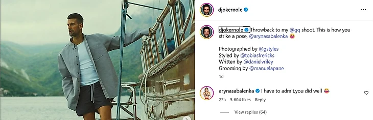 Фотосессией, сделанной в феврале, Новак отреагировал на недавнюю обложку GQ первой ракетки мира Арины Соболенко, подписав свой пост: «Возвращаюсь к своей фотосессии для GQ. Вот как нужно позировать, Арина Соболенко😆».