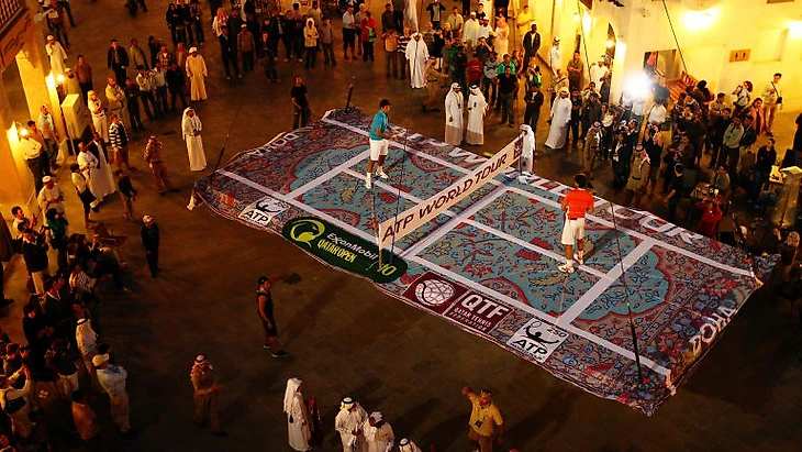 На турнире ATP-250 в Дохе, Катар, наступали сумерки, и игра была буквально приостановлена. Роджер Федерер и Рафаэль Надаль играли в теннис на высоте шести метров в воздухе.