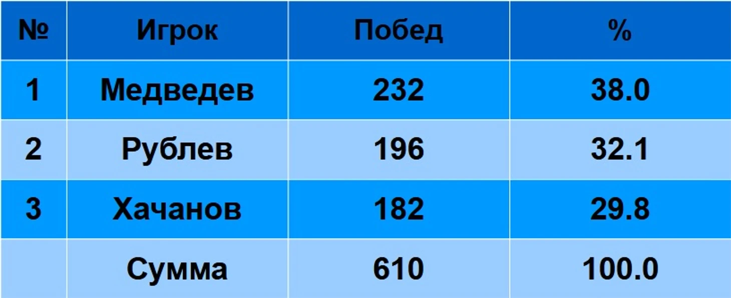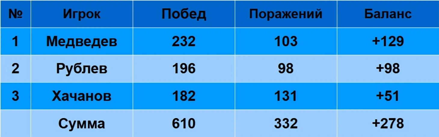 Впрочем, на момент написания статьи(вечер 7 августа), у Хачанова – 27 побед, у Медведева и Рублева по 26.