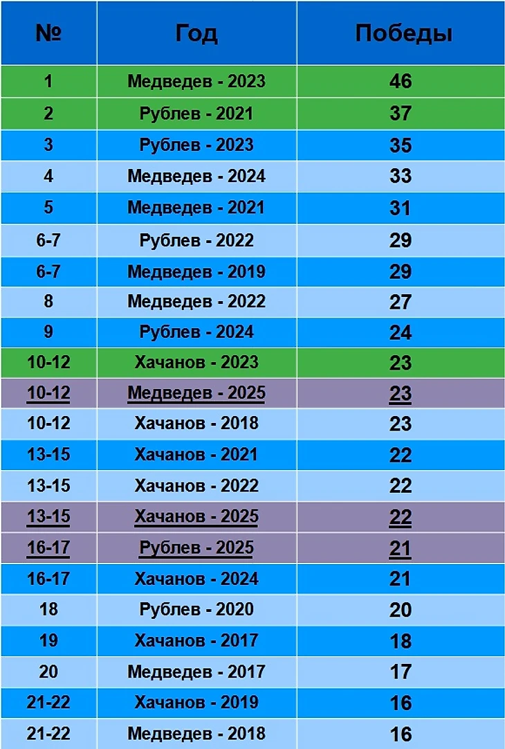 Медведев- 2023 первый. Неожиданно, Рублев-2020 второй, но, сезон тот был короткий, всего 25 игр Андрей сыграл. Медведев – 2021 третий. Лучший сезон Хачанова, 2023, 9-ый.