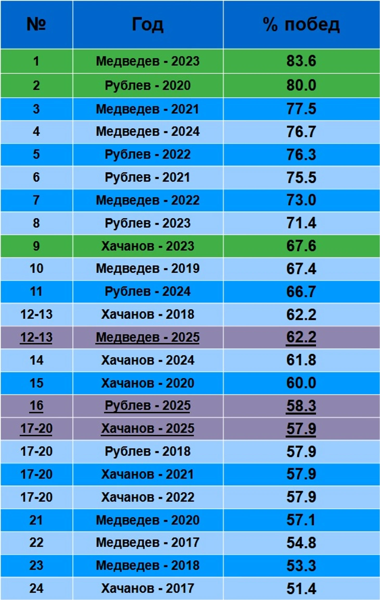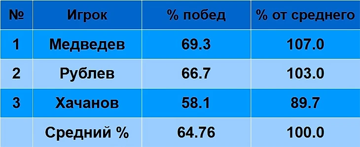 На 7 августа Хачанов и вовсе поднял процент побед до 62.8%(27 побед – 16 поражений), а это 12-ое место. У Медведева 61.9%(26-16), у Рублева 60.5% (26-17).