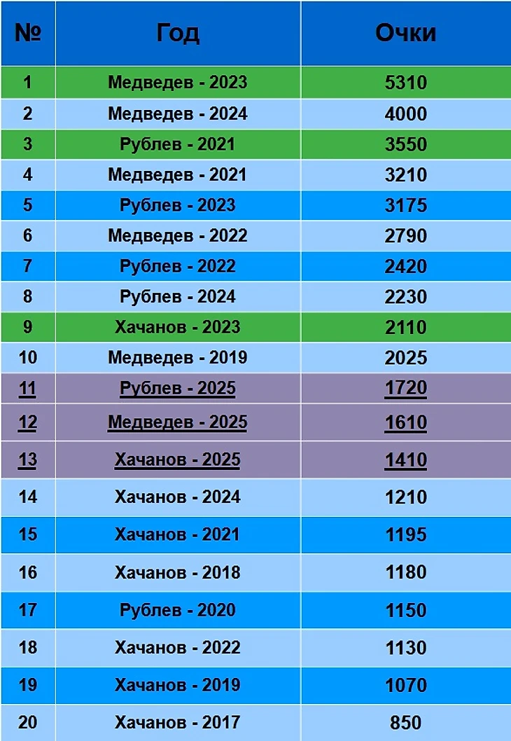 Итак. Лучший сезон это Медведев-2023 с 5310 очками.Второй, Медведев – 2024(и это без единого титула!). На третьем месте, Рублев-2021. Лучший из сезонов Хачанова, 2023, на девятом месте.