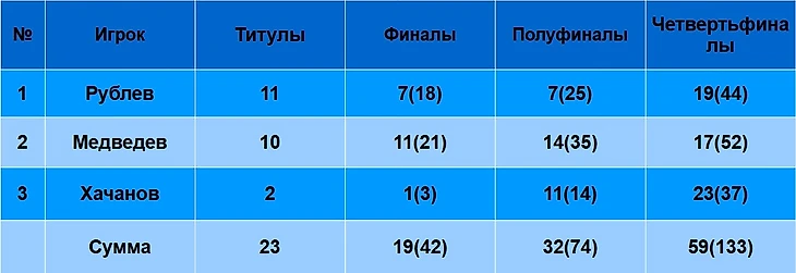 Забавно, что, вроде бы везде Медведев был лучшим, а титулов больше взял все же Рублев. Хотя, Даниил даже в финал чаще выходил, чем Андрей…