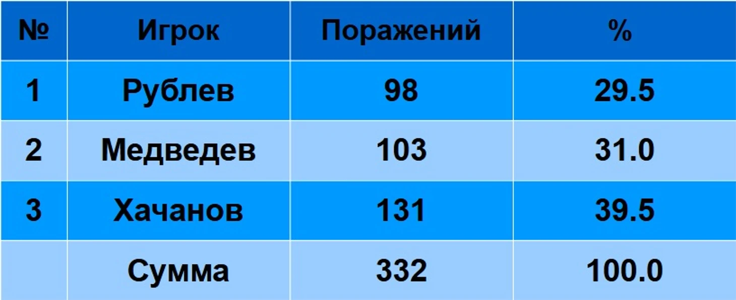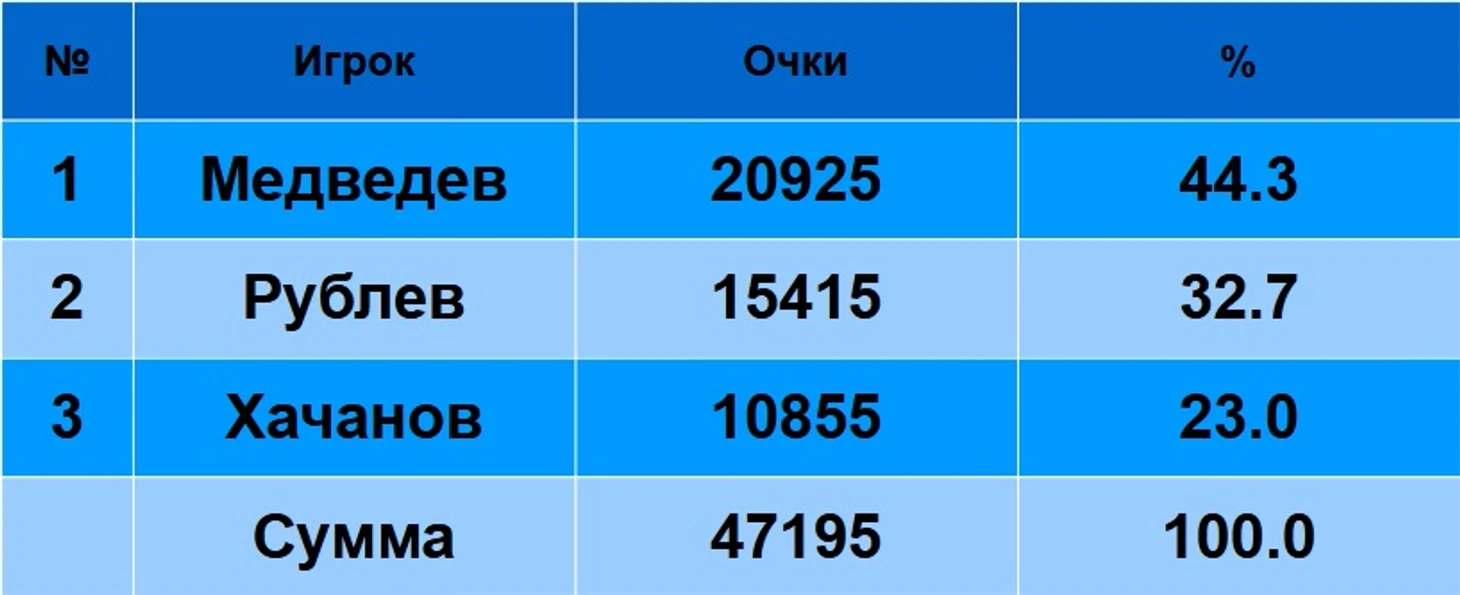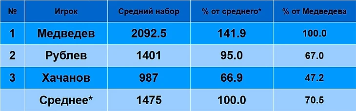 Порядок игроков такой же, но все значительно плотней. Таких отрывов уже нет. Тот же Хачанов вполне неплохо смотрится даже на фоне Медведева, а к Рублеву и вовсе довольно близко находится.