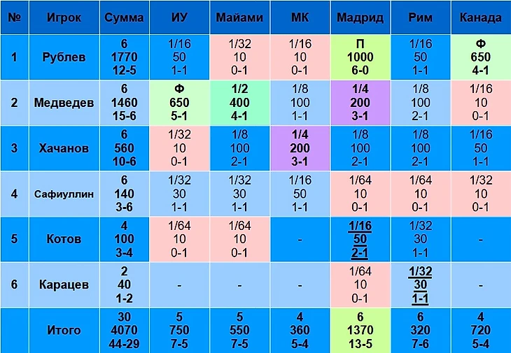 В ячейках столбцов «ИУ» -..- «Торонто» первая строчка – стадия турнира, до которой дошел игрок, вторая строчка – число побед и поражений, третья – количество очков, заработанных на турнире. В ячейках столбца «Сумма» первая строчка число участий(Сафиуллин не играл в МК-25, поэтому, у него 5, а не 6), вторая – сумма побед и поражений, третья – сумма очков на Мастерсах в 2025.