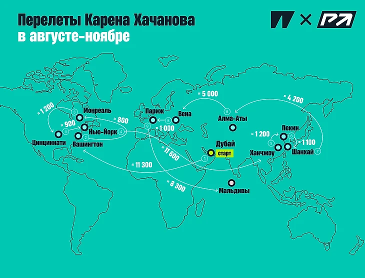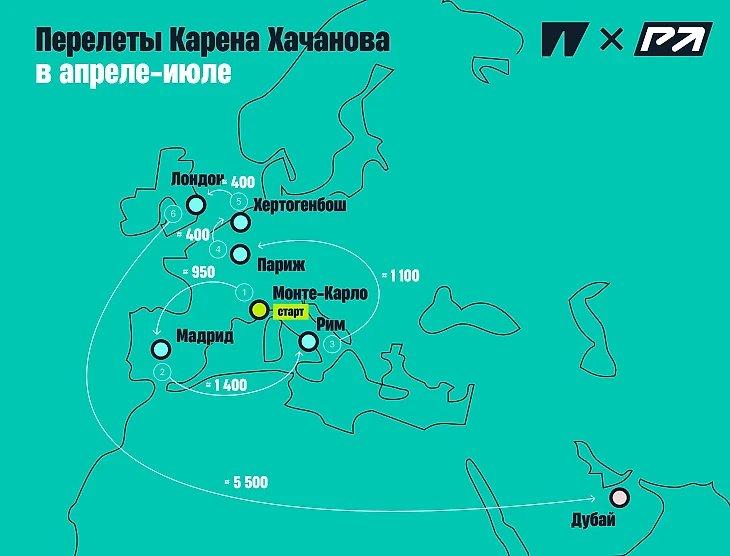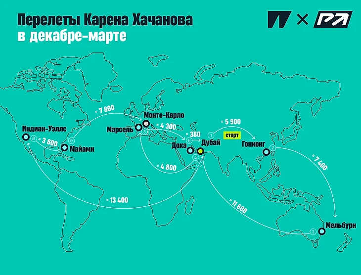 Много путешествует и Карен Хачанов – который при этом базируется в Дубае. И в целом у него наиболее типичный для топ-теннисиста график.