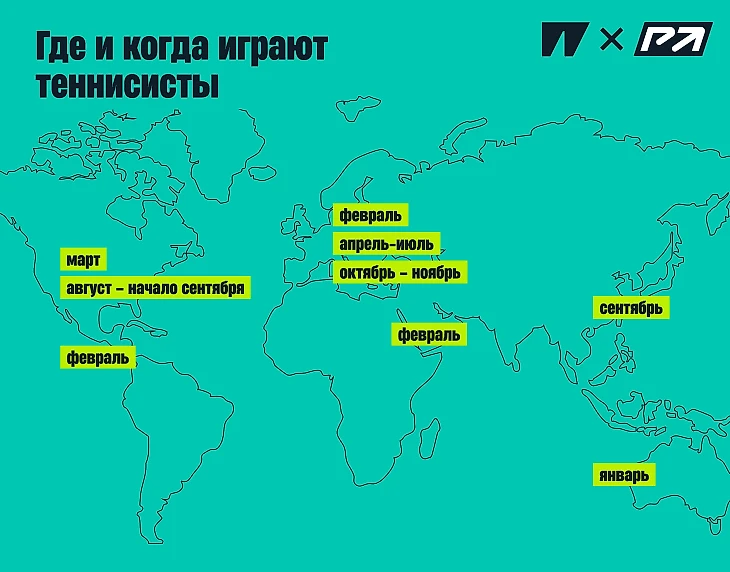 Теннисисты очень много путешествуют. В основном туре сезон длится примерно 10 с половиной месяцев, но вообще турниры проходят почти круглый год – на всех континентах, кроме Антарктиды.